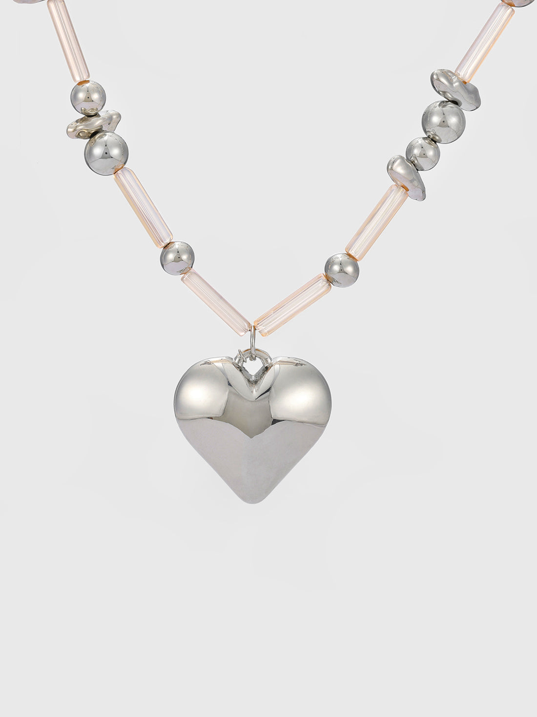 A silver chain scattered with beads and a bold heart drop. Cute but with bite—the...