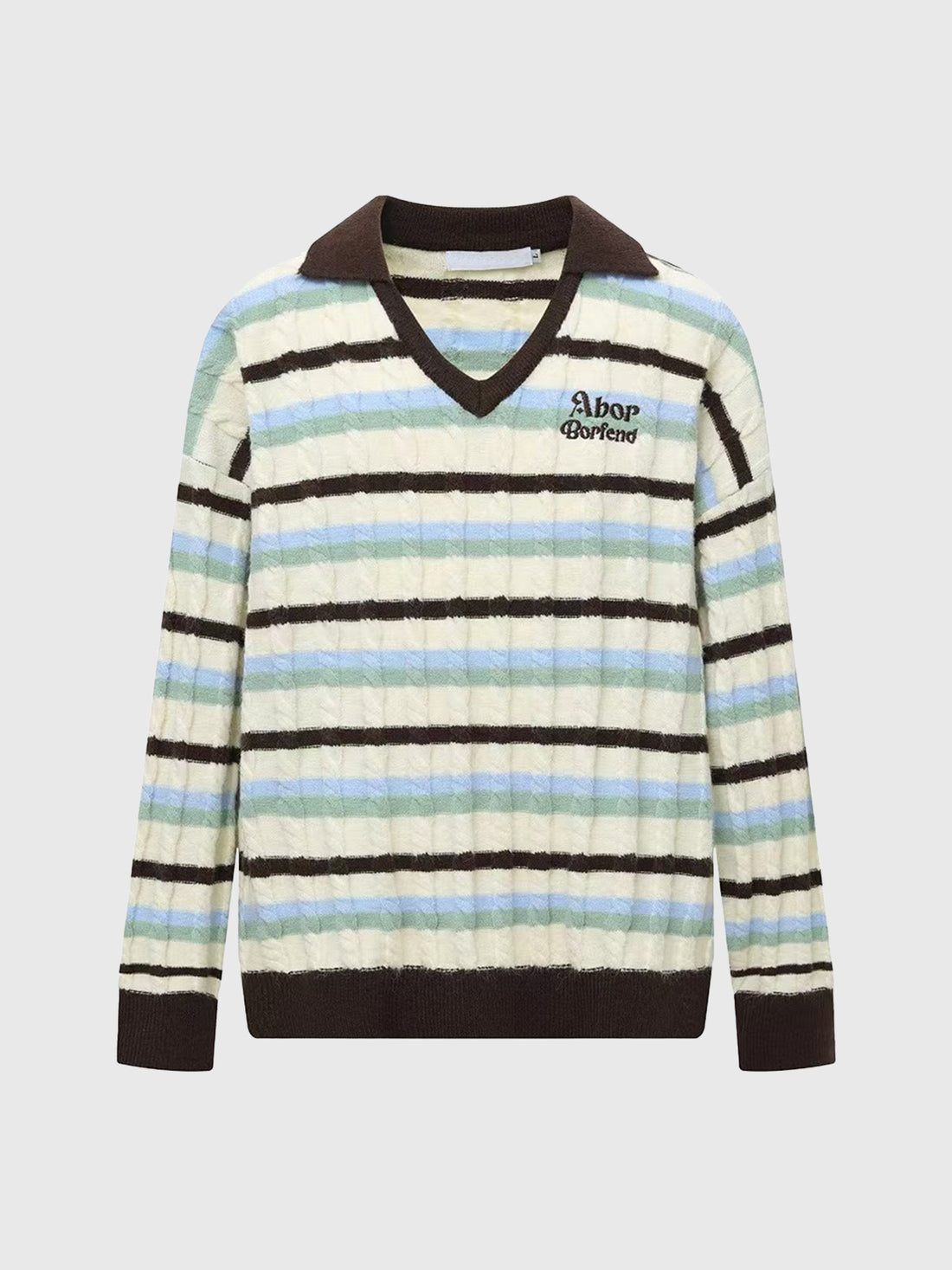 Blueberry Toast V-Neck Sweater – Cream Stripe