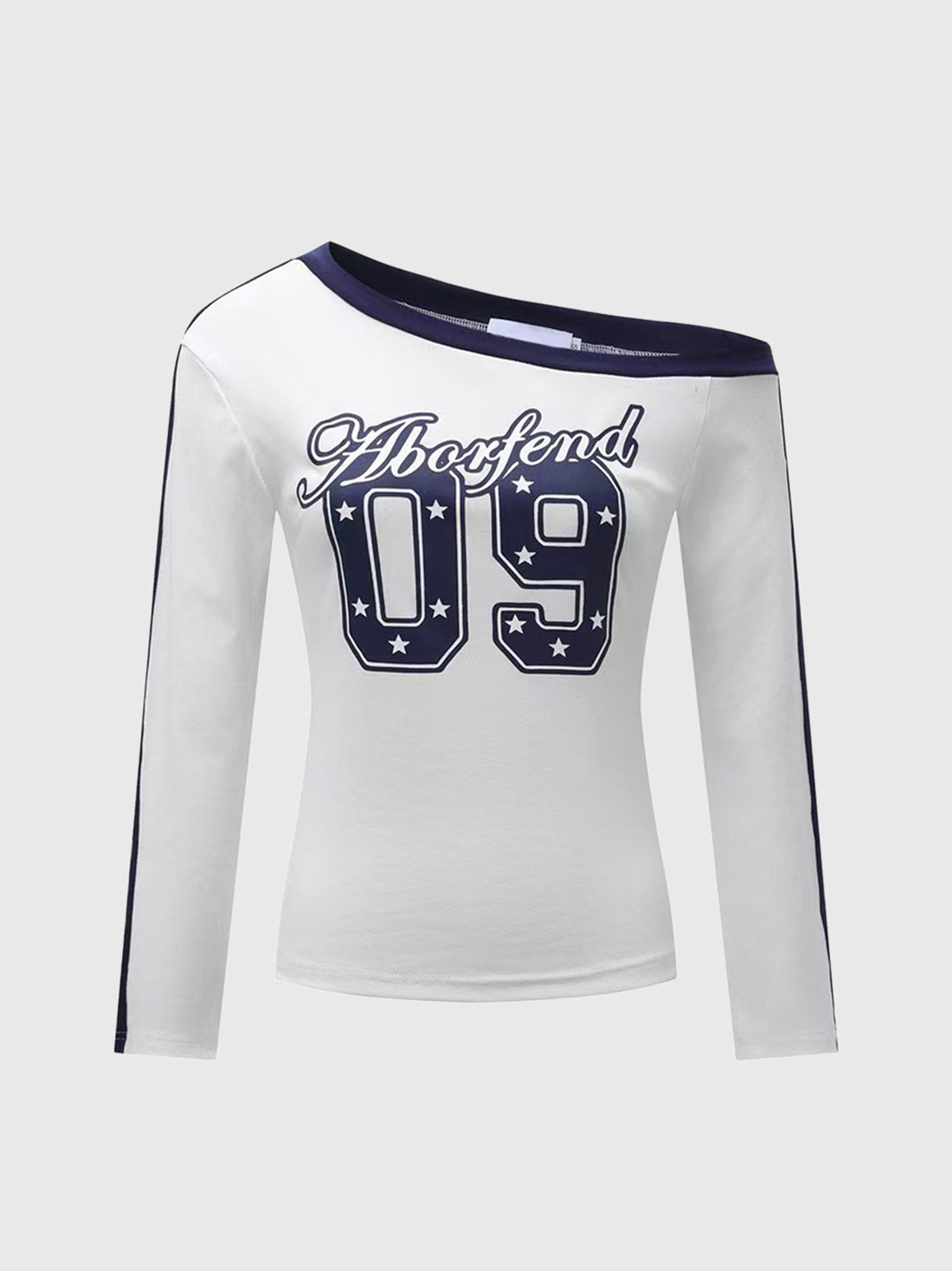 A tee that tilts the rulesโone bare shoulder, navy trim, and vintage varsity energy. Perfect...