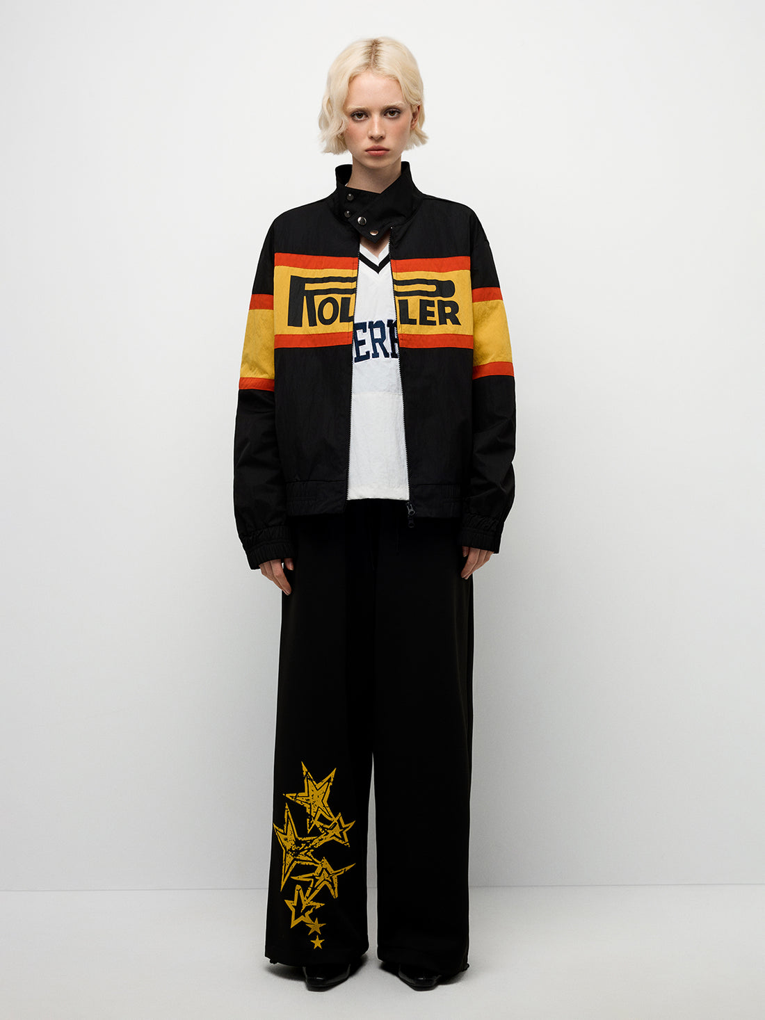 Cropped stance, bold chest band, and retro rib trims. Stand collar for movie-scene posture; soft...