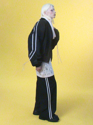 Tough silhouette meets delicate details. This black set pairs zippered edges with pearl accents -...