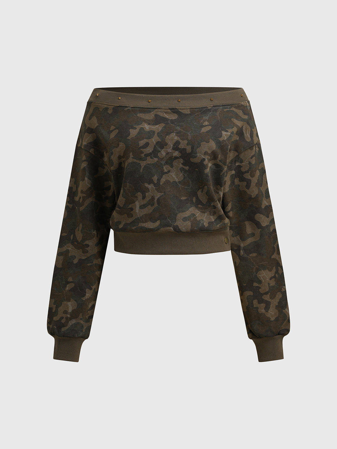 This off-shoulder camo sweater combines bold print with a dash of sparkle. Subtle studs on...
