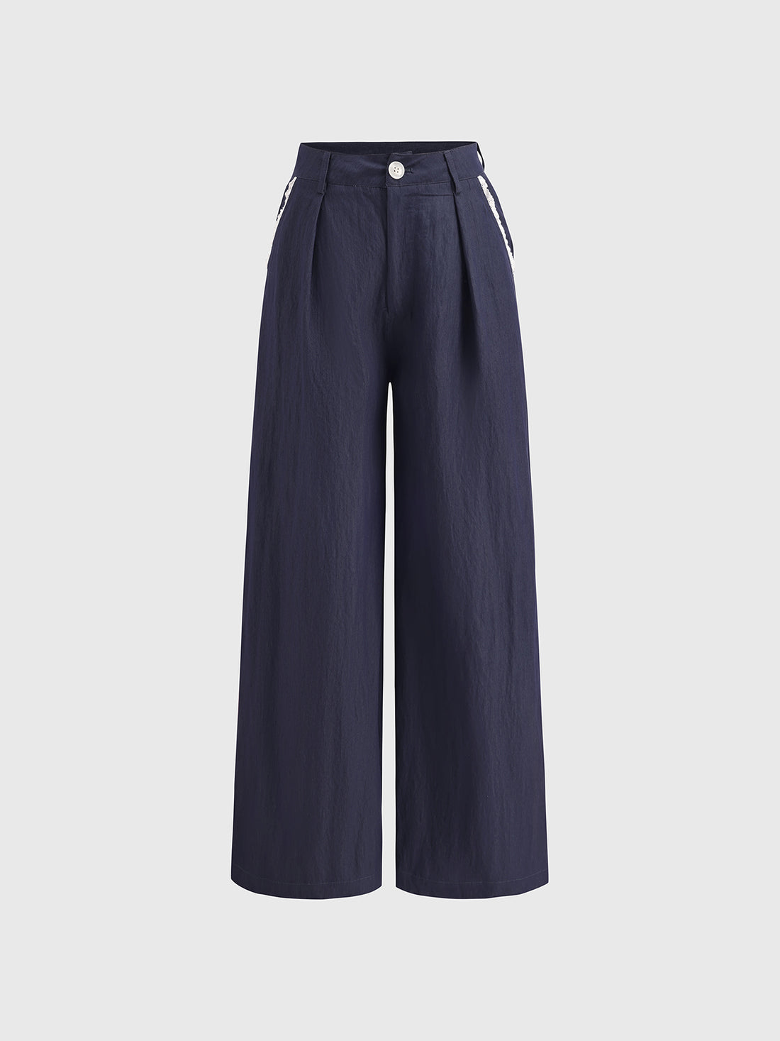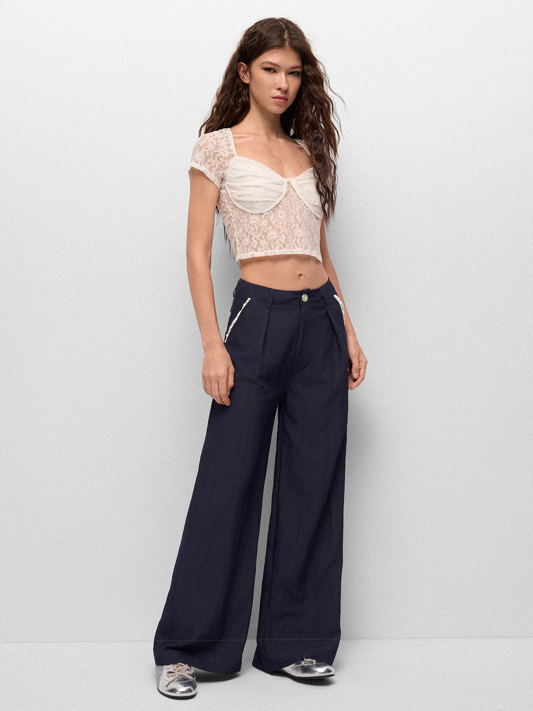 Not your manager’s work pants. These trousers feature a subtle lace trim at the pockets—like...
