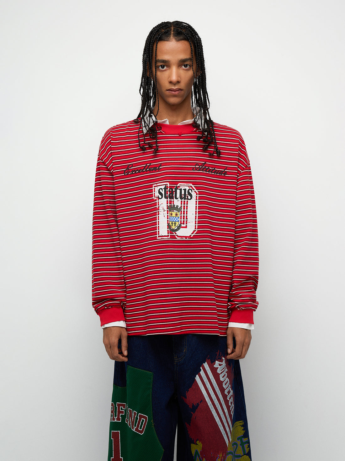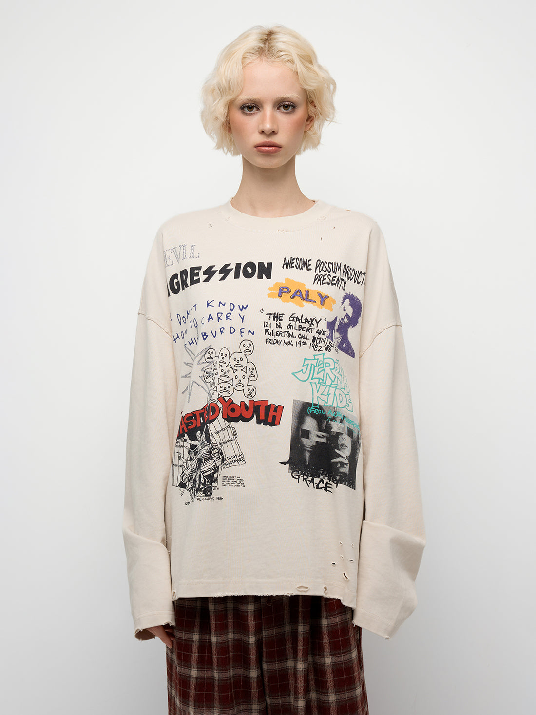 A cream sweatshirt that doubles as a mood board. Graphics and slogans collide into an...