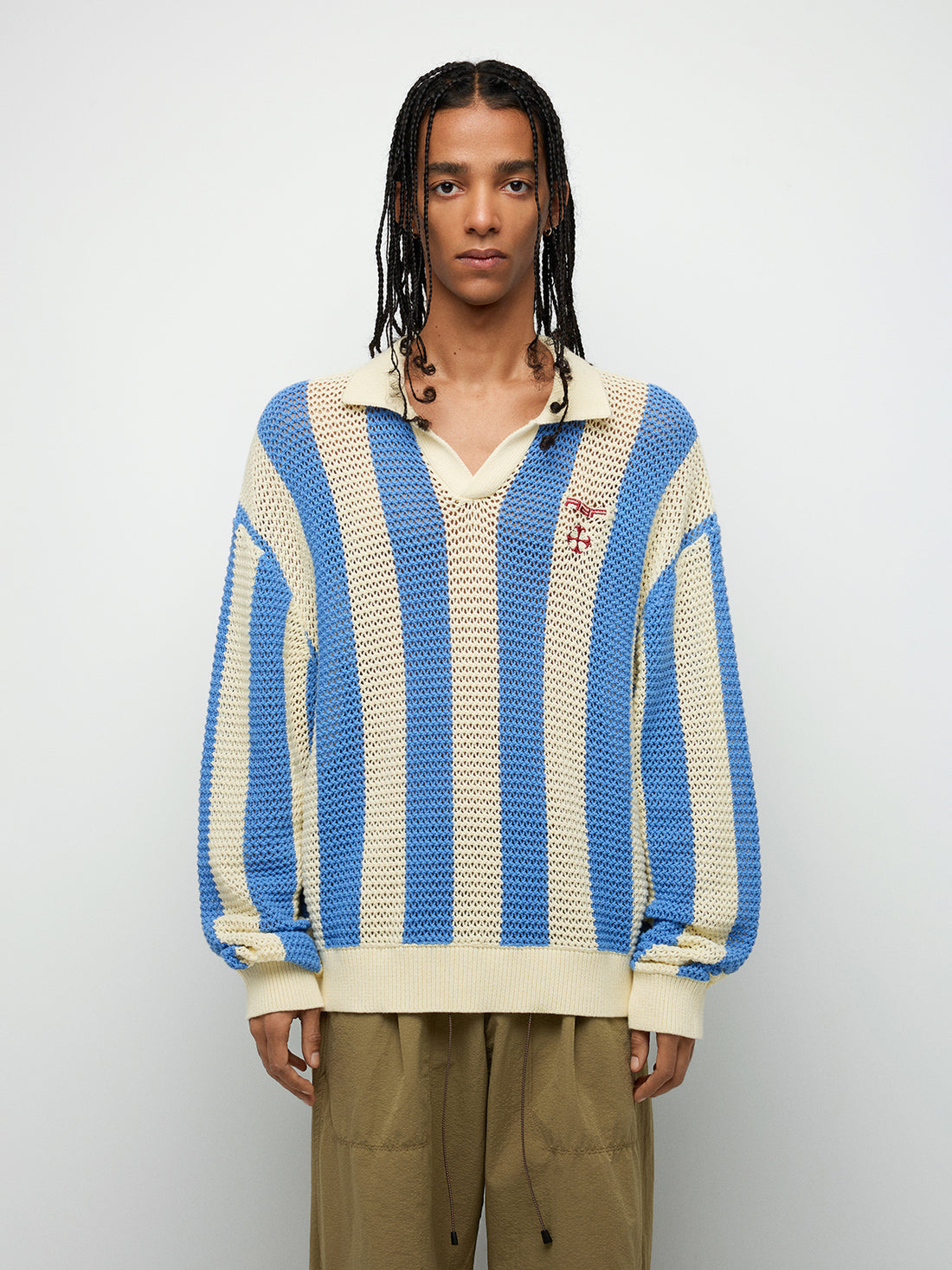 Striped Open-Knit Long Sleeve Polo – Sky Blue