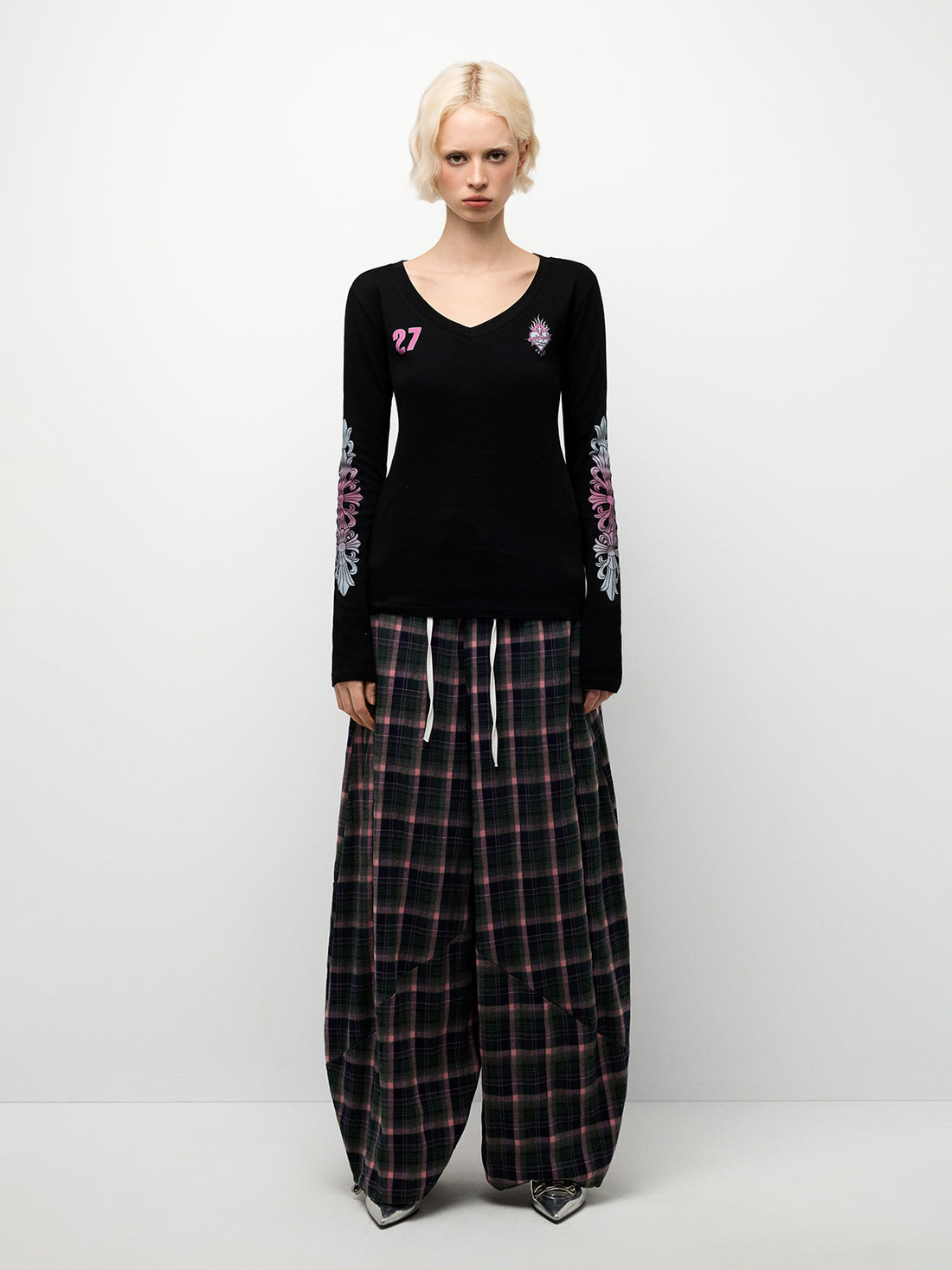Unique black wide-leg pants featuring a contrasting plaid inner waistband and red drawstring. Completed with...