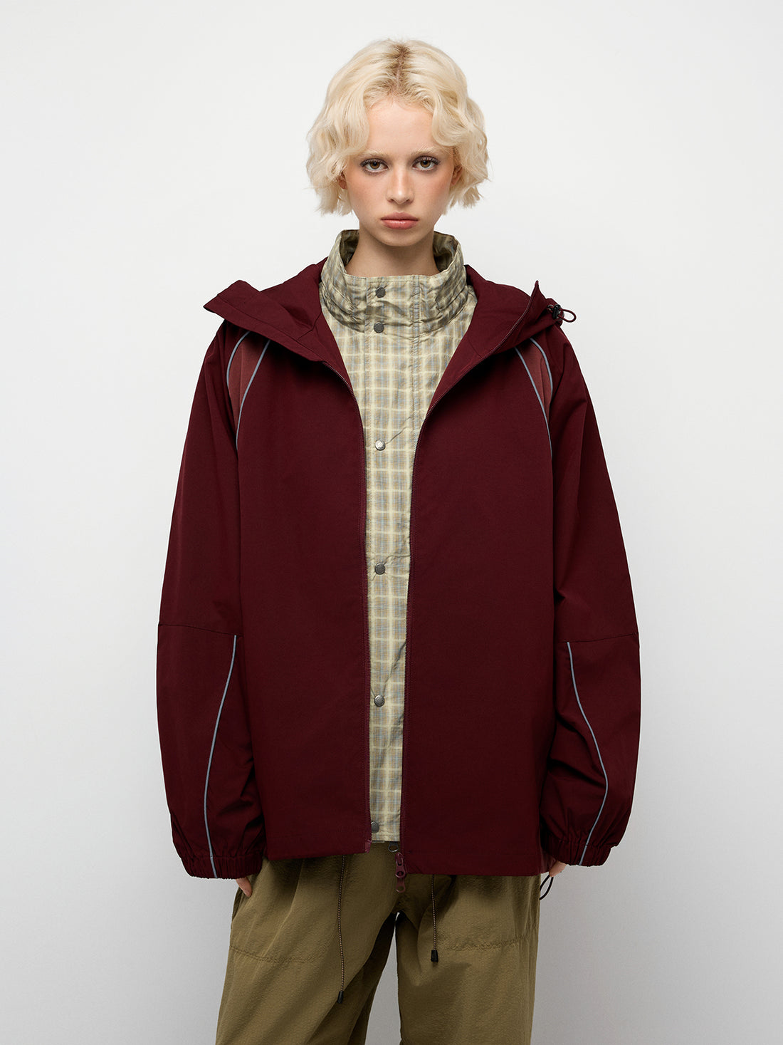 A sleek wine-red windjacket with drawstring hood and functional pockets. Simple, striking, and unisex—made to...