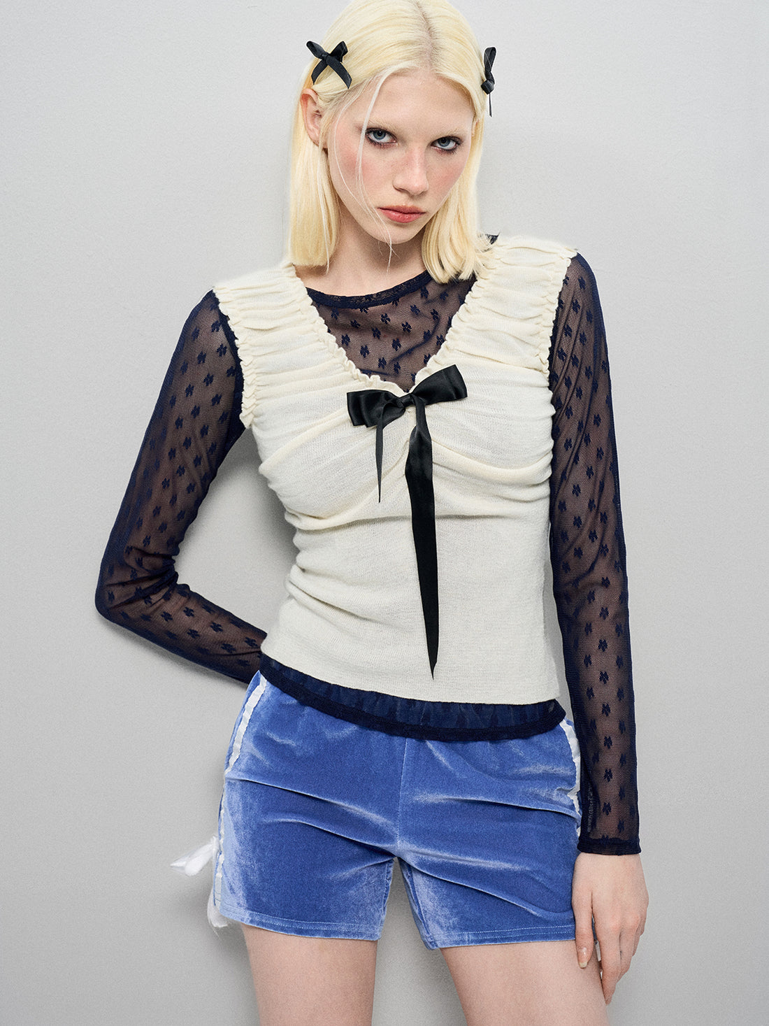 lastic V-neck with delicate ruching, finished with ribbon bow pin. The detachable bow adds instant...