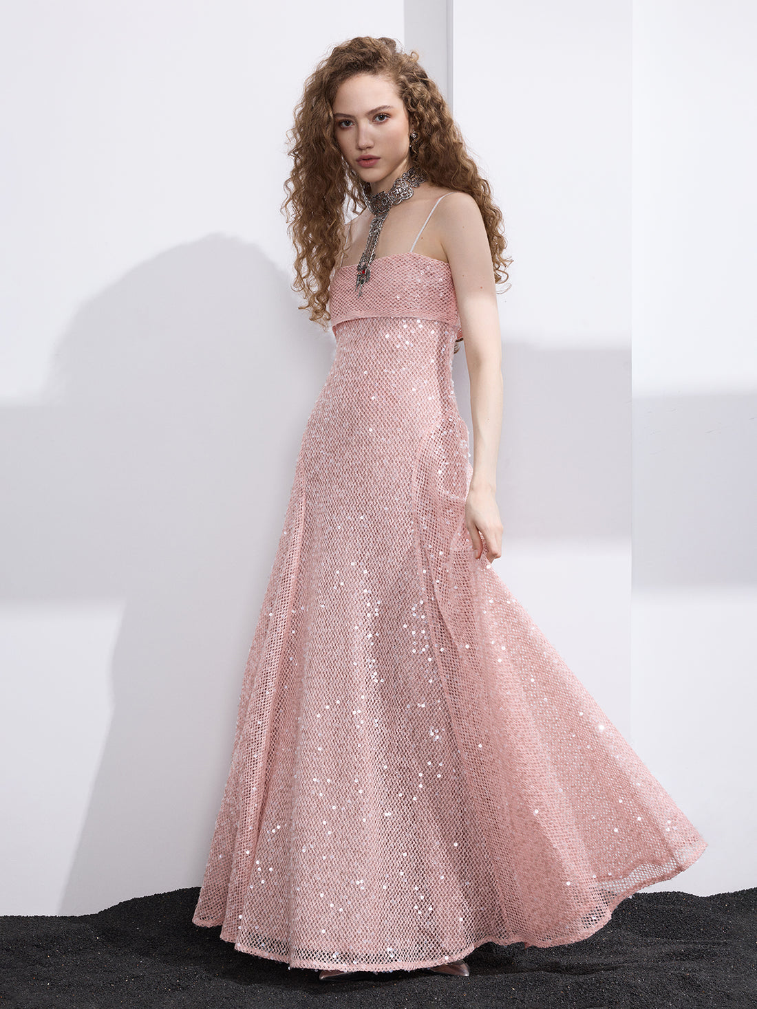 Dolled Office Rhinestone Mesh Maxi Dress - Pink