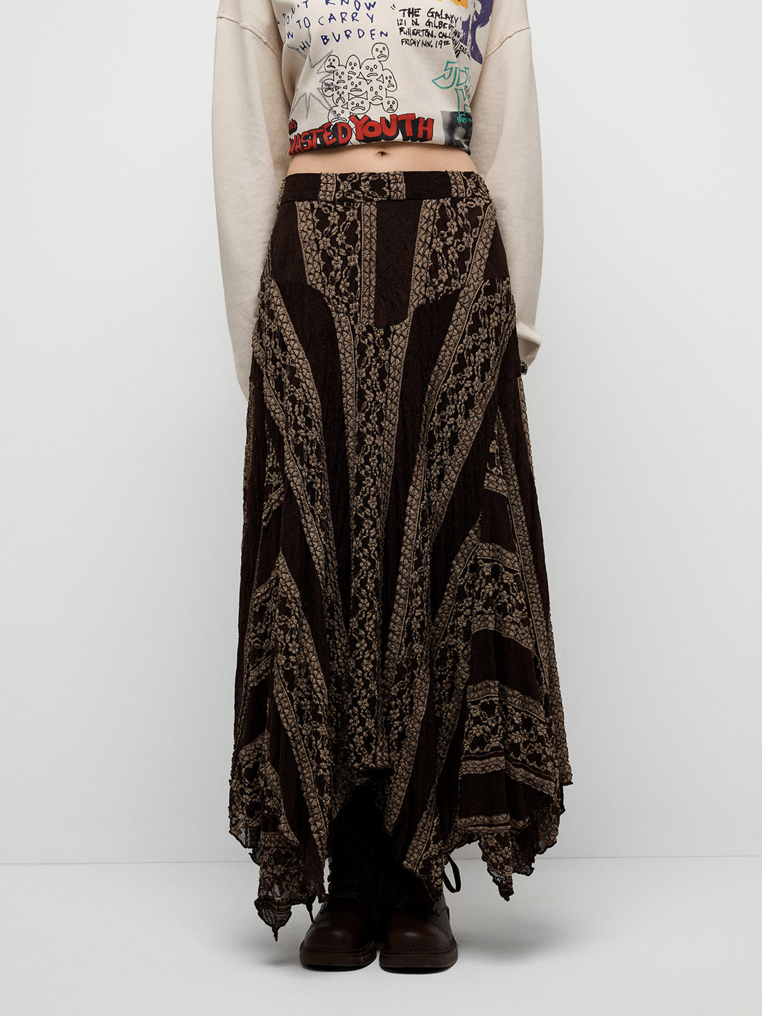 Flowing with a patchwork of lace and textured panels, this skirt captures a romantic yet...