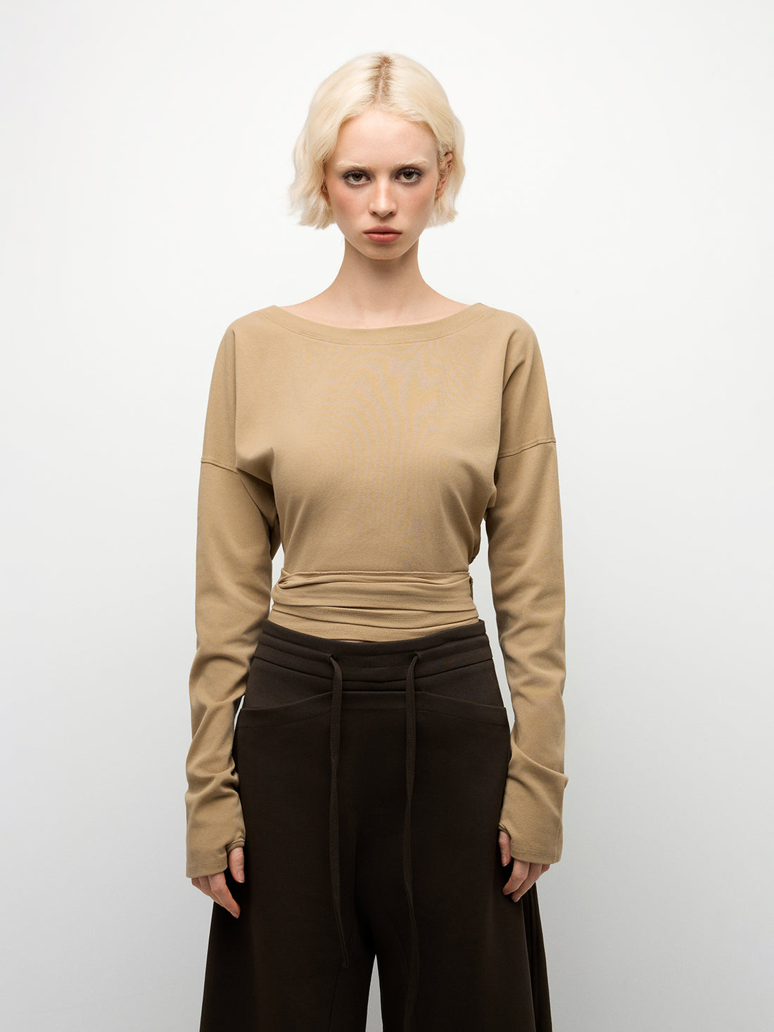 A collection of effortless, softly structured tops in muted earth tones (beige/taupe/khaki), each designed to...