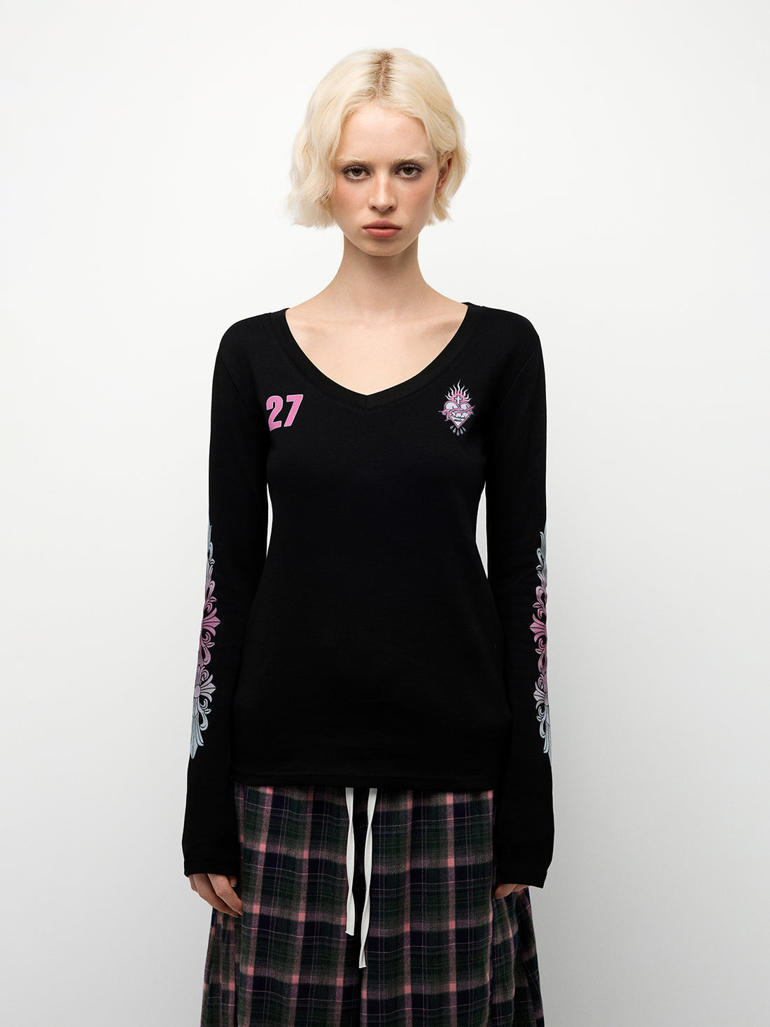 A dramatic black top with bold gothic graphics. Central white crucifix with pink shadowing features...