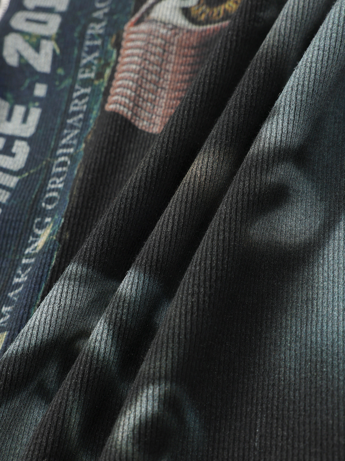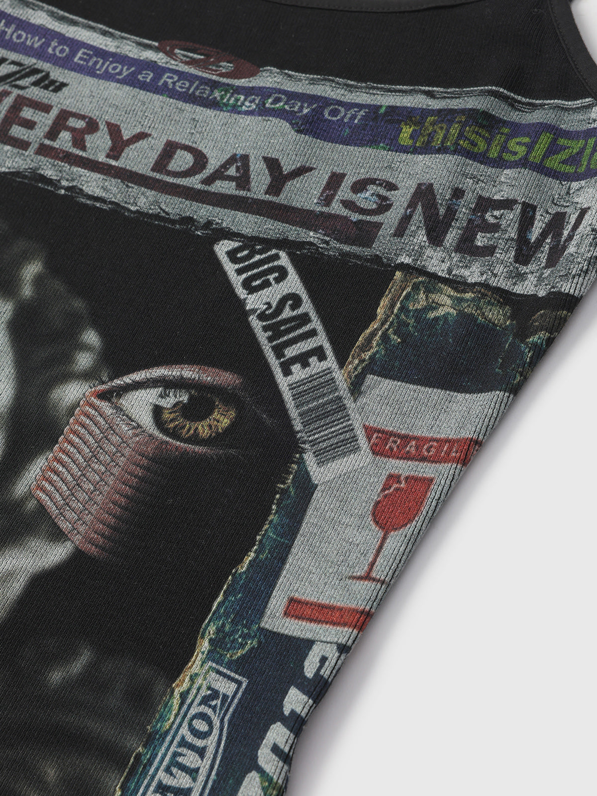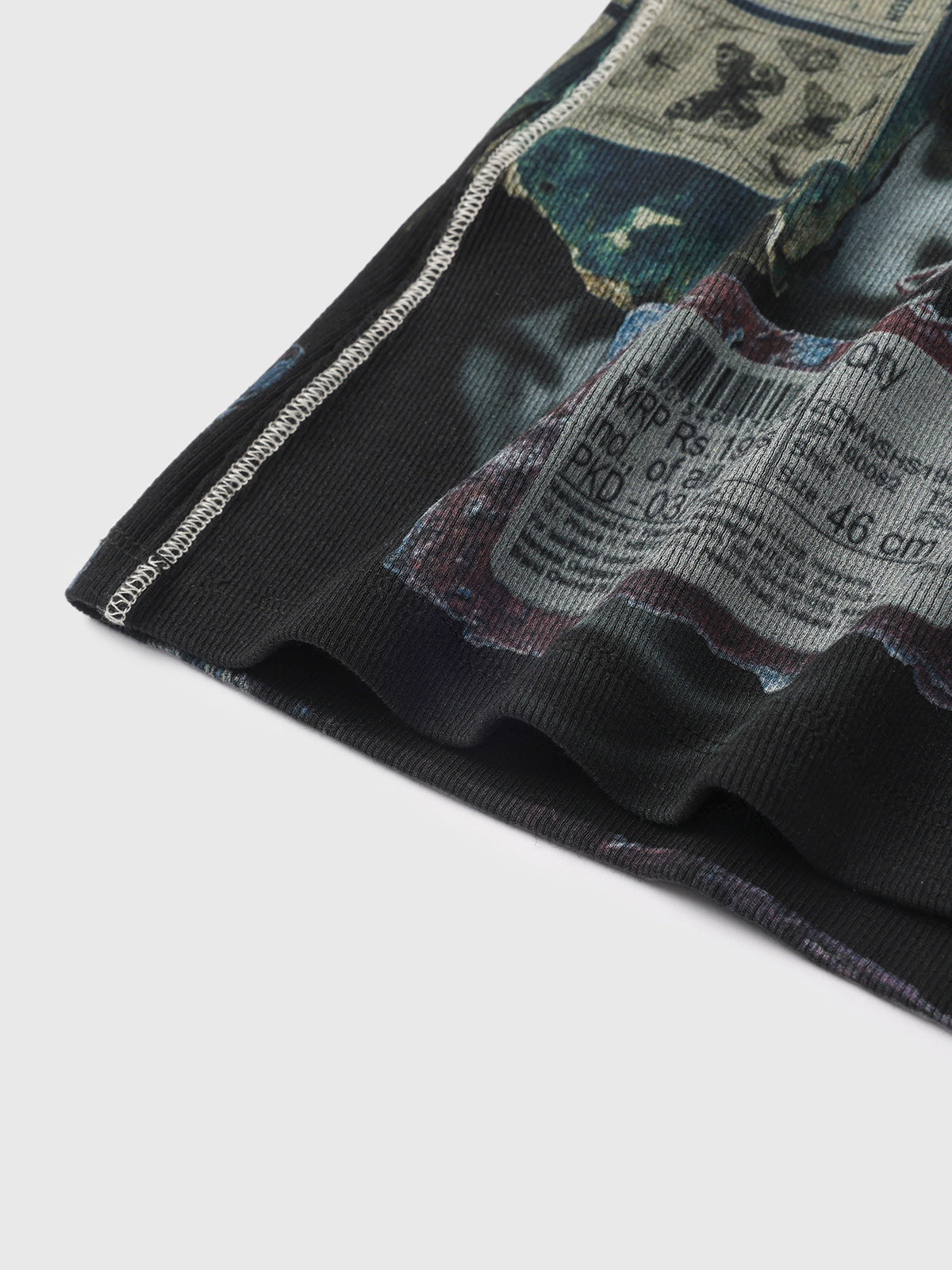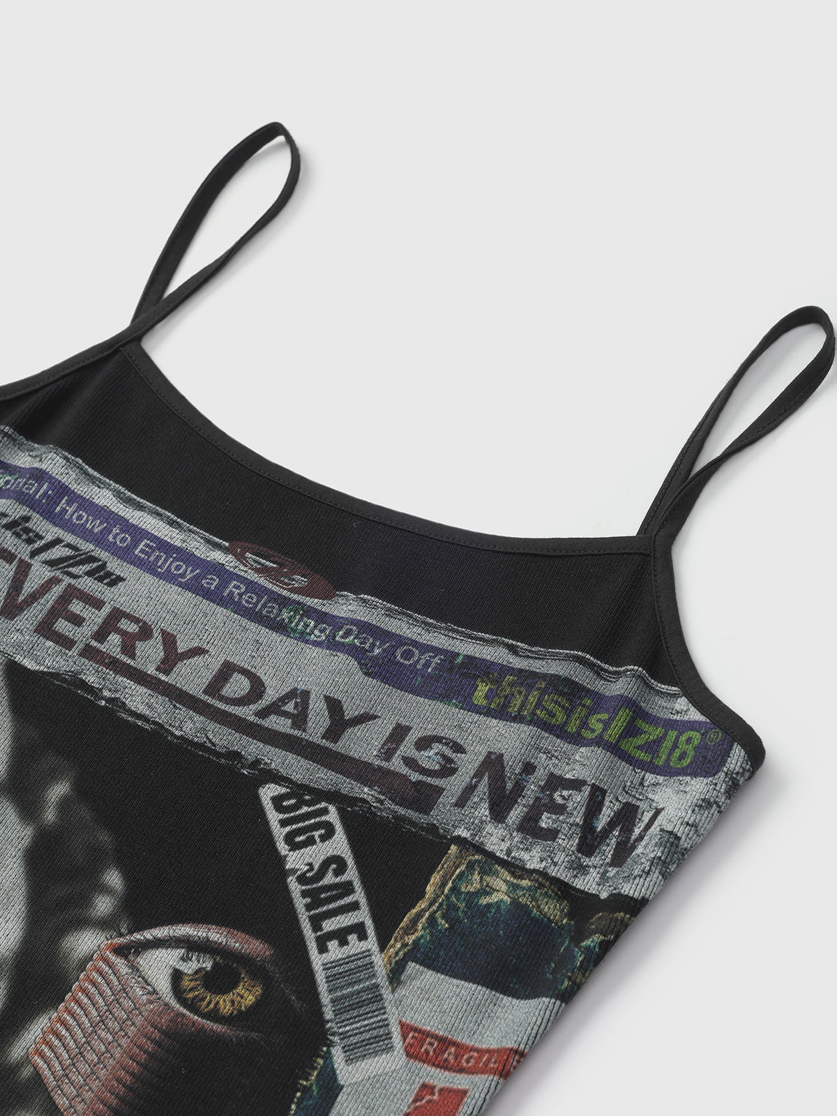 This fitted bodycon dress showcases a bold collage-style graphic print with striking abstract motifs, including faces, text, and layered vintage-inspired details. Designed with thin spaghetti straps and a curve-hugging silhouette, it delivers a modern statement look that blends streetwear energy with an art-inspired aesthetic.