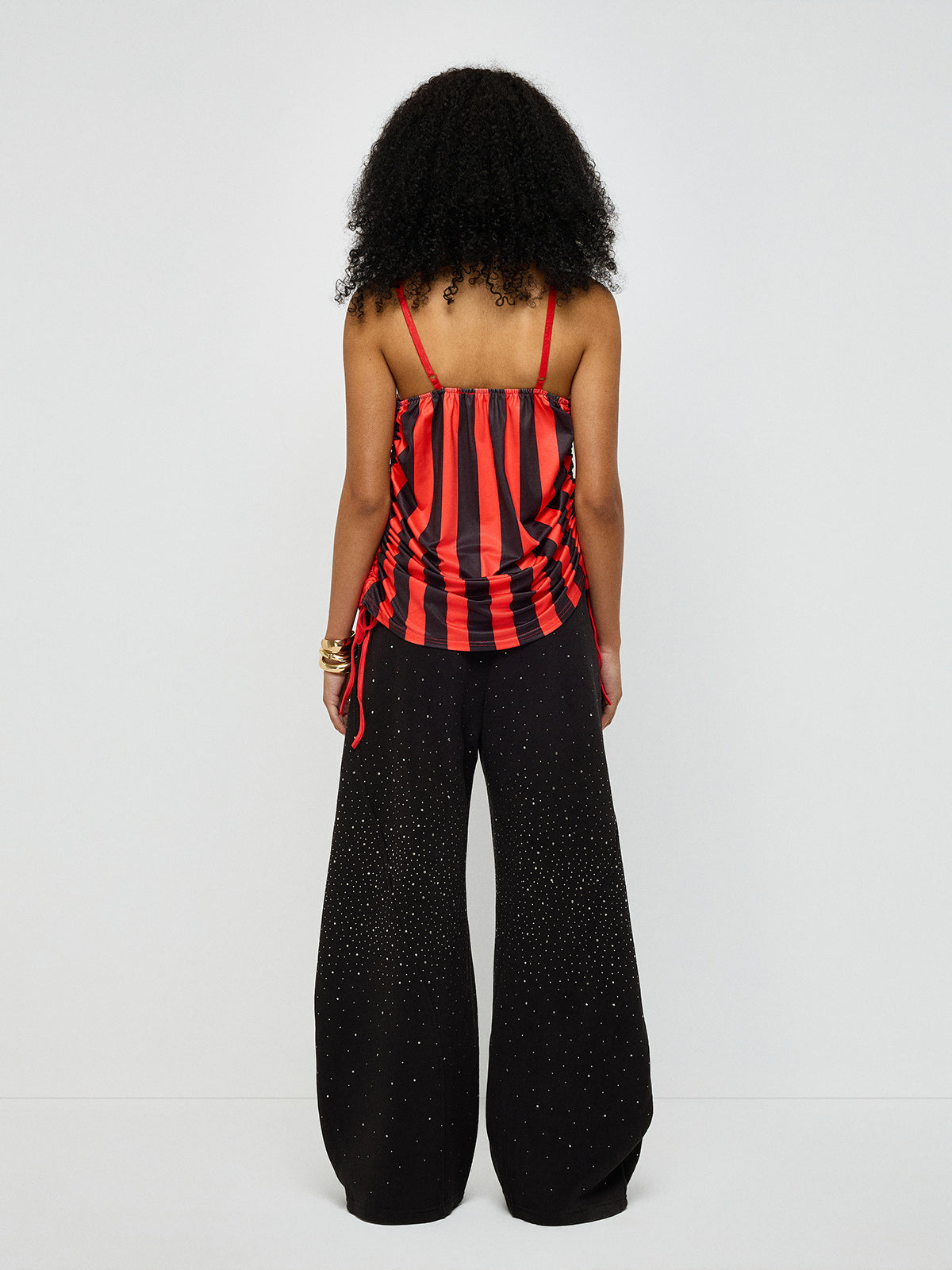 Cut to move the long way around. These curved-leg pants catch light with scattered rhinestones, shaping the body without locking it in. Relaxed through the leg, sharp at the waist—made for walking slow, leaving late, and not checking the time. They don’t ask for attention. They keep it.