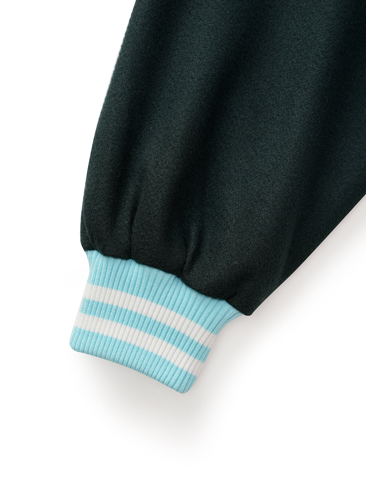 Dark green meets purple pop, stitched bold across the chest. A preppy jacket that looks like it was made for game night but lives better at cafés and city corners. Classic cut, contrast details—because lettering should always have main character energy.