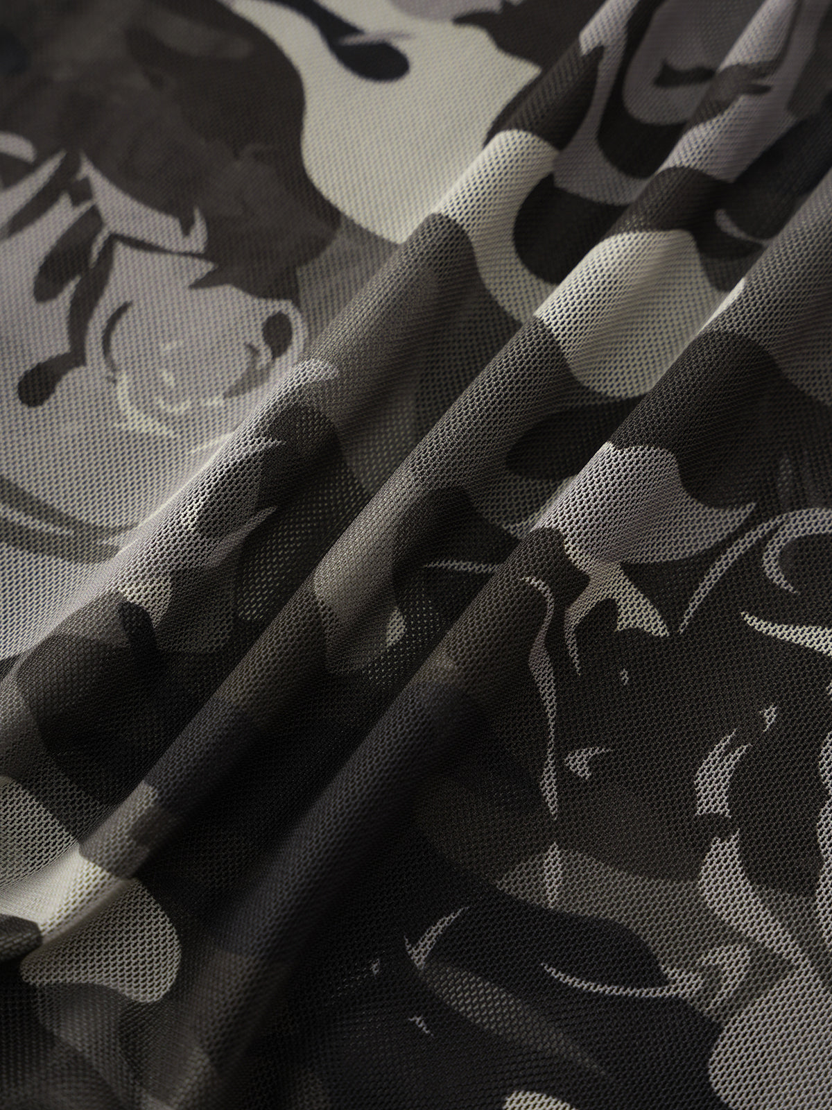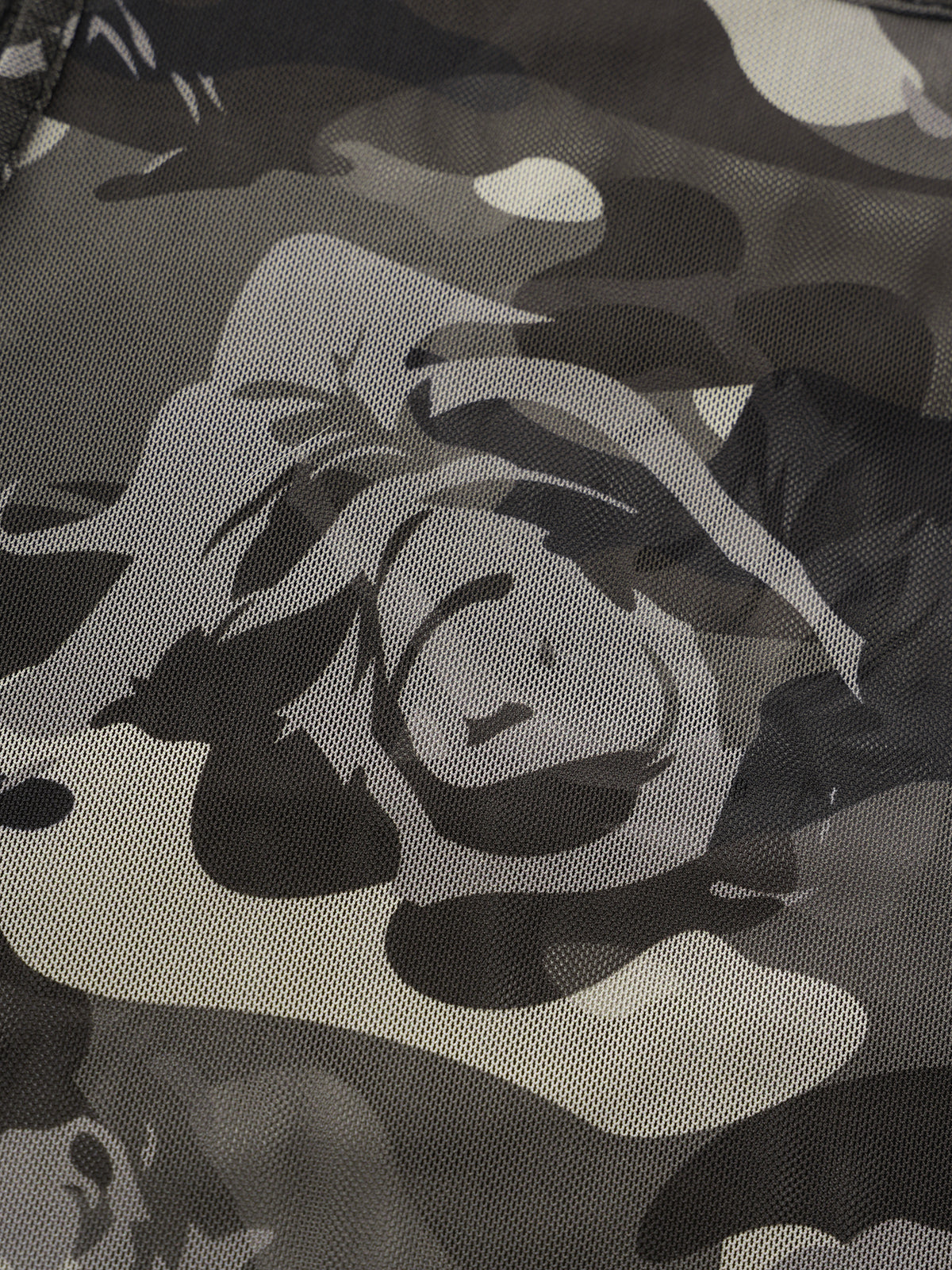 A camo slip with hidden roses blooming through the print. A slinky mesh dress that looks tough up close but keeps a soft undertone. Effortless for day, striking at night.