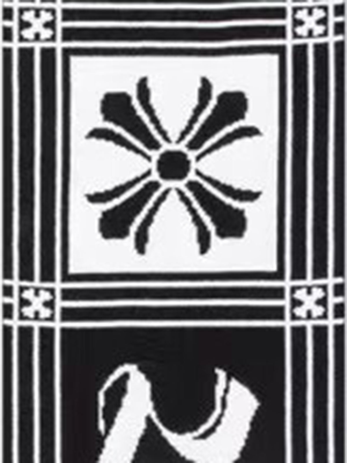 Patterned like a secret alphabet. Soft knit texture meets strong contrast design. Wrap it over leather or denim for a museum afternoon or late coffee run when the air starts to bite.