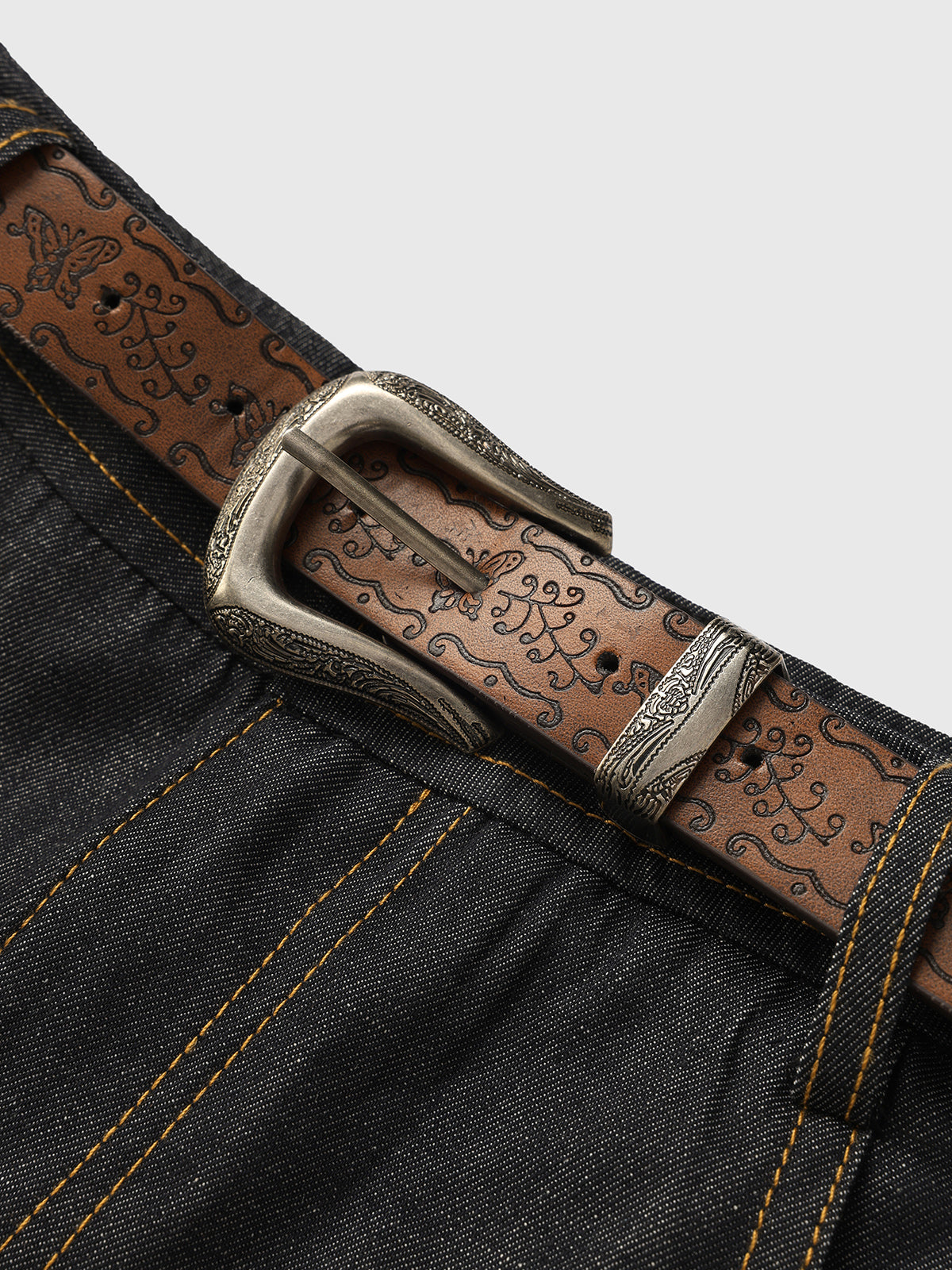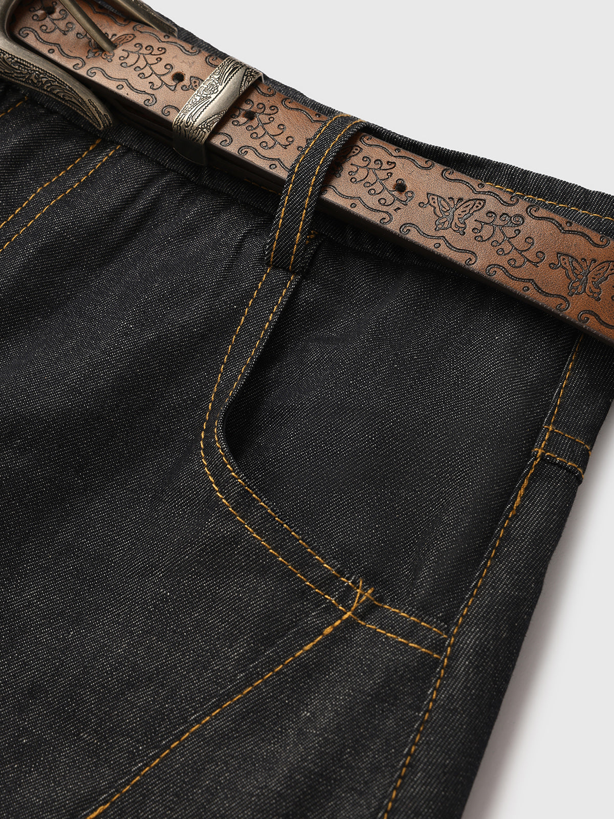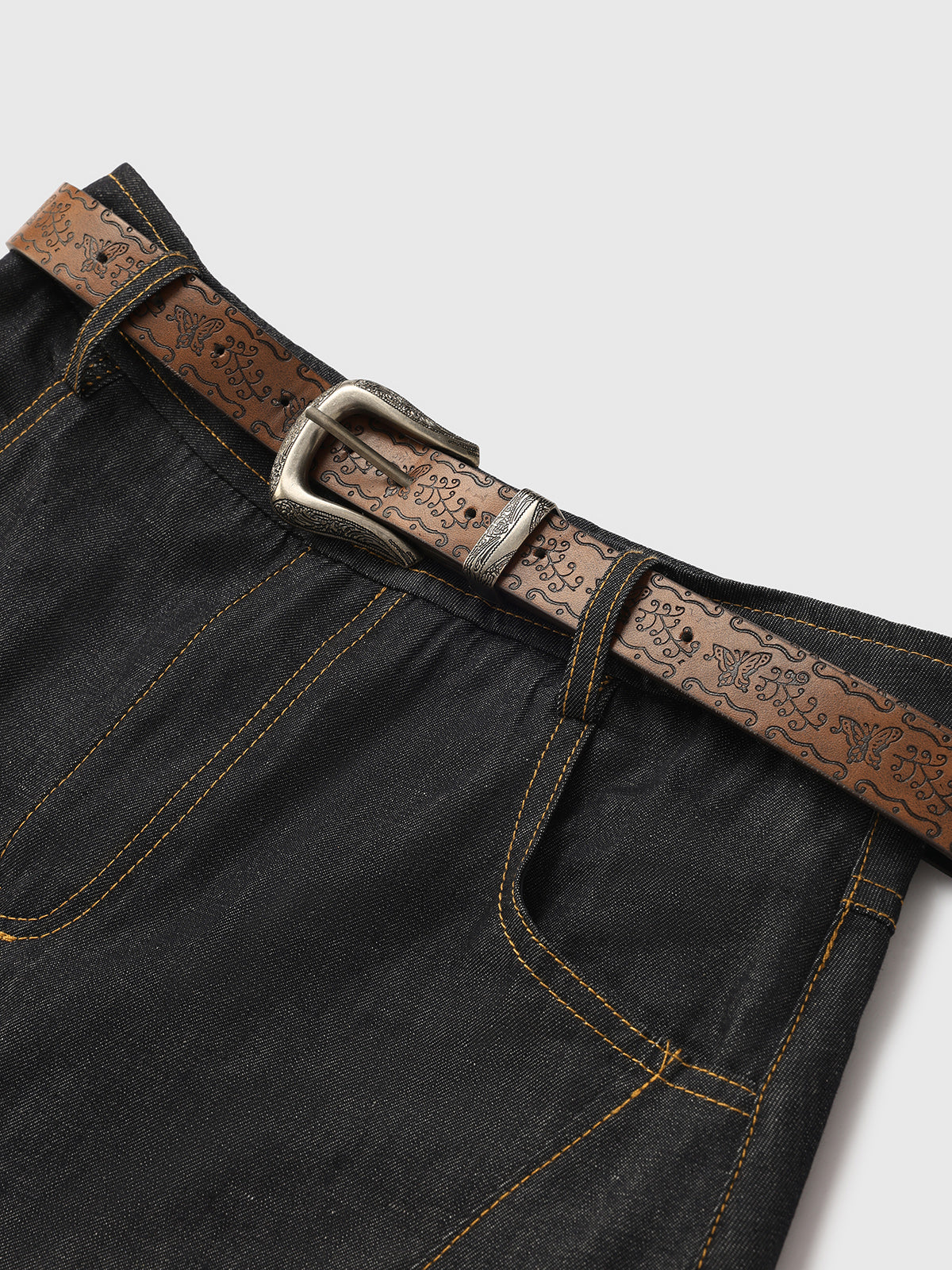 This flared midi skirt blends tough denim with soft plaid insets for a unique, deconstructed look. Finished with detailed topstitching and a vintage-style patterned belt, it bridges utilitarian design with playful retro style.