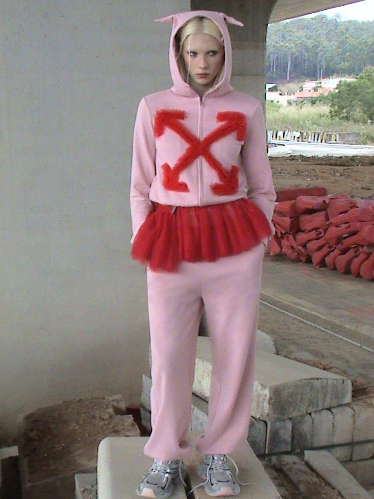 Horns up, rules down. This pink paradox pairs devil ears with safety-line irony - choose your rebellion flavor.