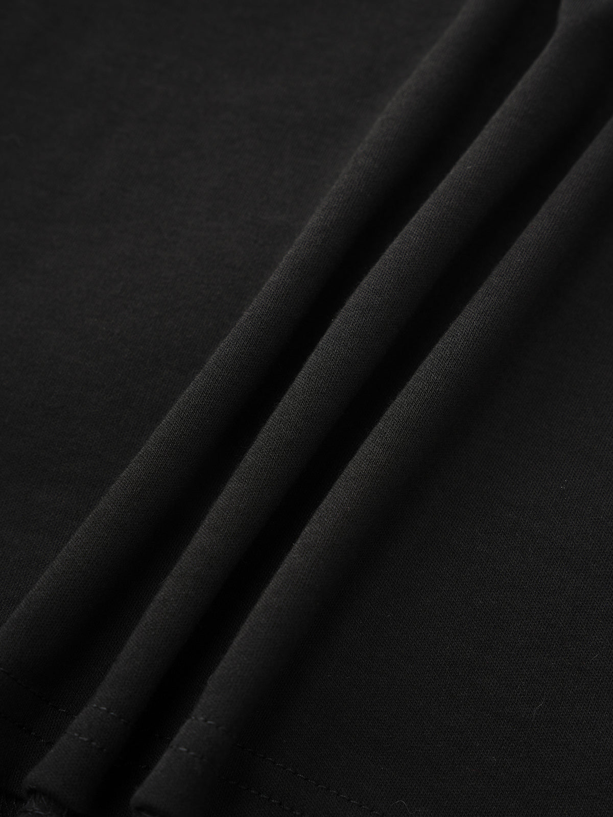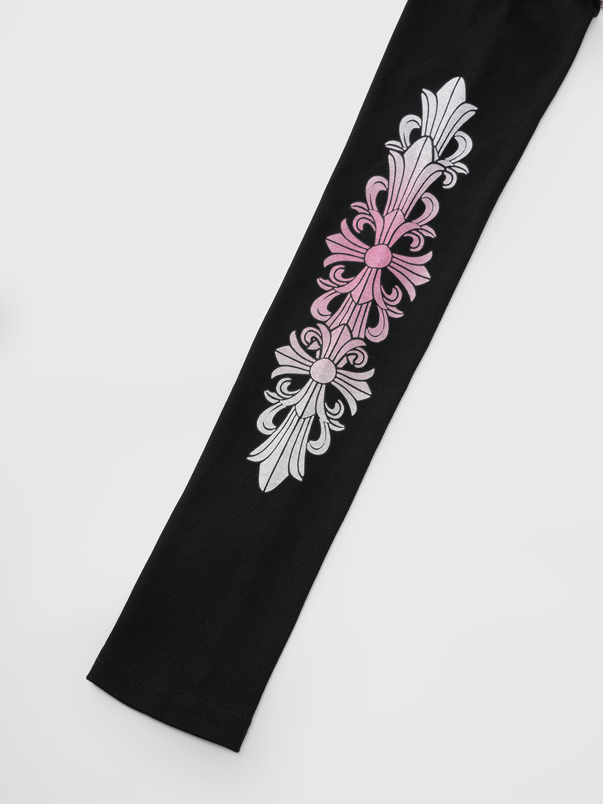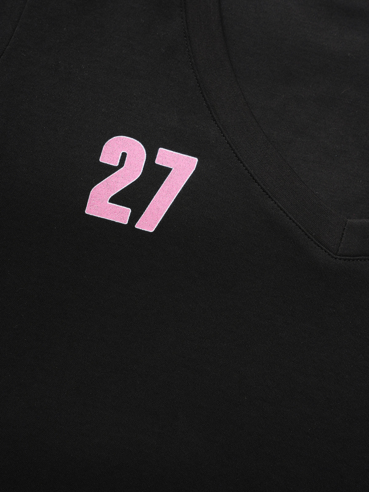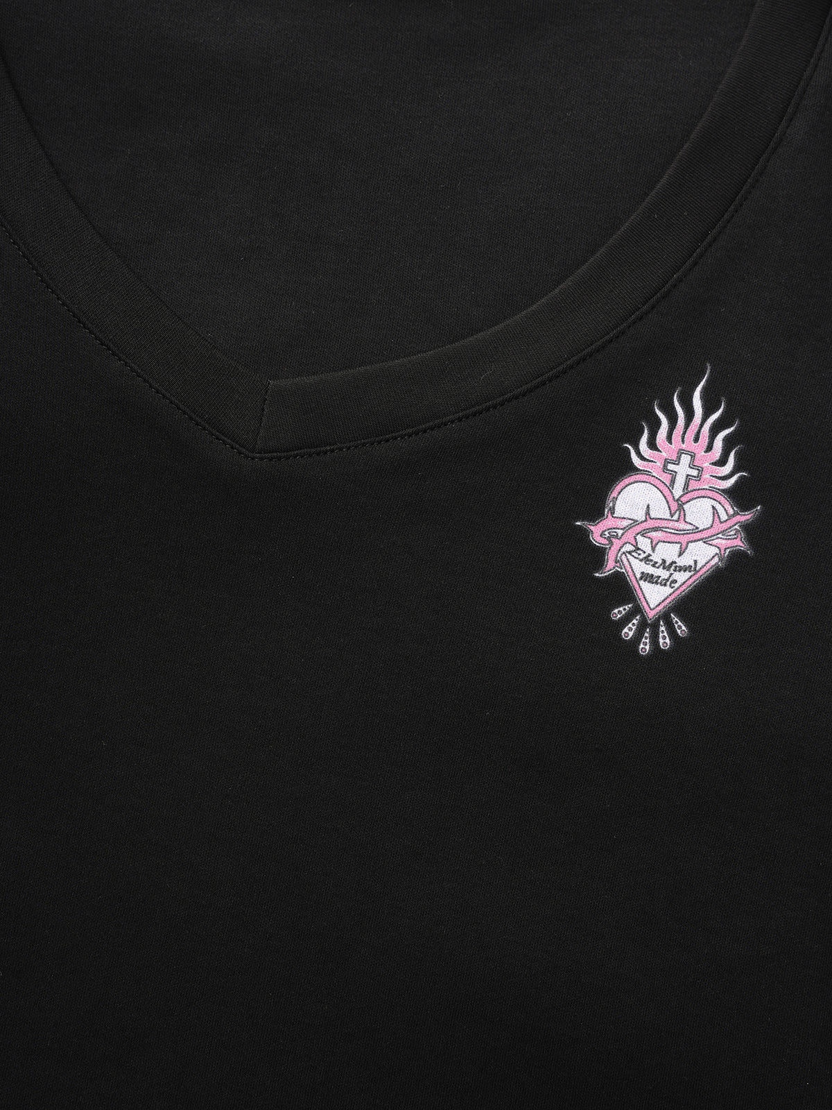 A dramatic black top with bold gothic graphics. Central white crucifix with pink shadowing features a pierced heart ("EleMMI made") and flowing ribbon. Upper chest shows "ELEMMI" in pink and "BiuBimi" in cursive, while lower section has brand tags. Sleeves repeat cross/heart patterns in white/pink. Companion piece has V-neck with flaming "27" badge and floral sleeve patterns. Balances charcoal base with pink accents, working for edgy street or alternative fashion.