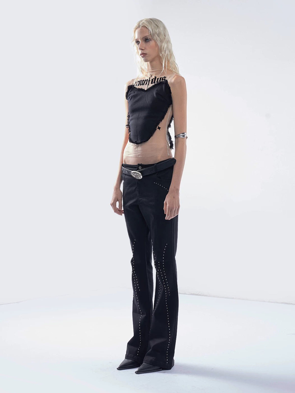 This tank keeps its feelings partially hidden. Sheer mesh panels frame the body gently, turning a simple tank into something charged and personal, while the contrast tones shape a heart-inspired silhouette that feels intimate without being obvious. The contrast tones Wear it alone or layered—either way, it reads closer than expected.