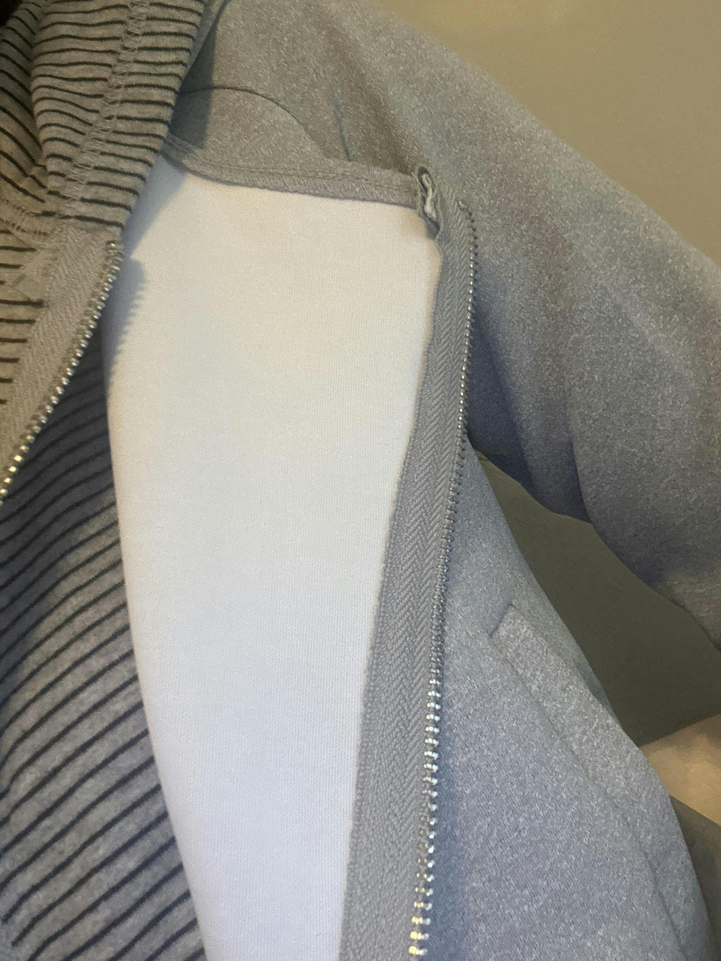 Classic ivory zip hoodie on the outside, striped surprise inside. A simple switch in zip-up styling gives it new attitude—your go-to for street sleek layers.