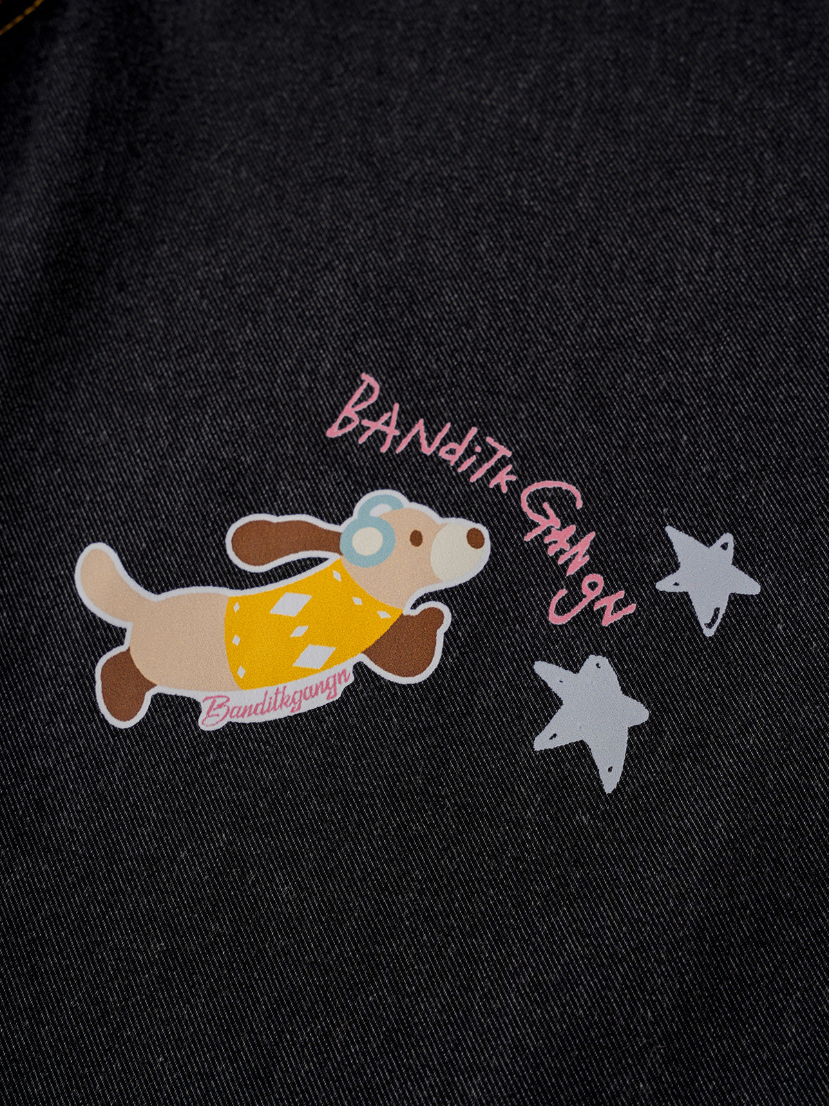 Loose black jeans sprinkled with random graphics because straight-laced denim is boring. A wearable collage of everything you didn’t say out loud.