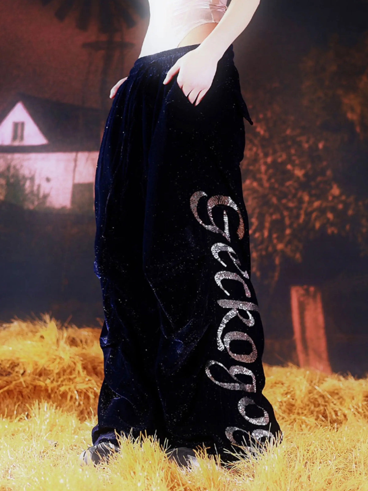 Last Light Curve Velvet Pants – Navy Crystal