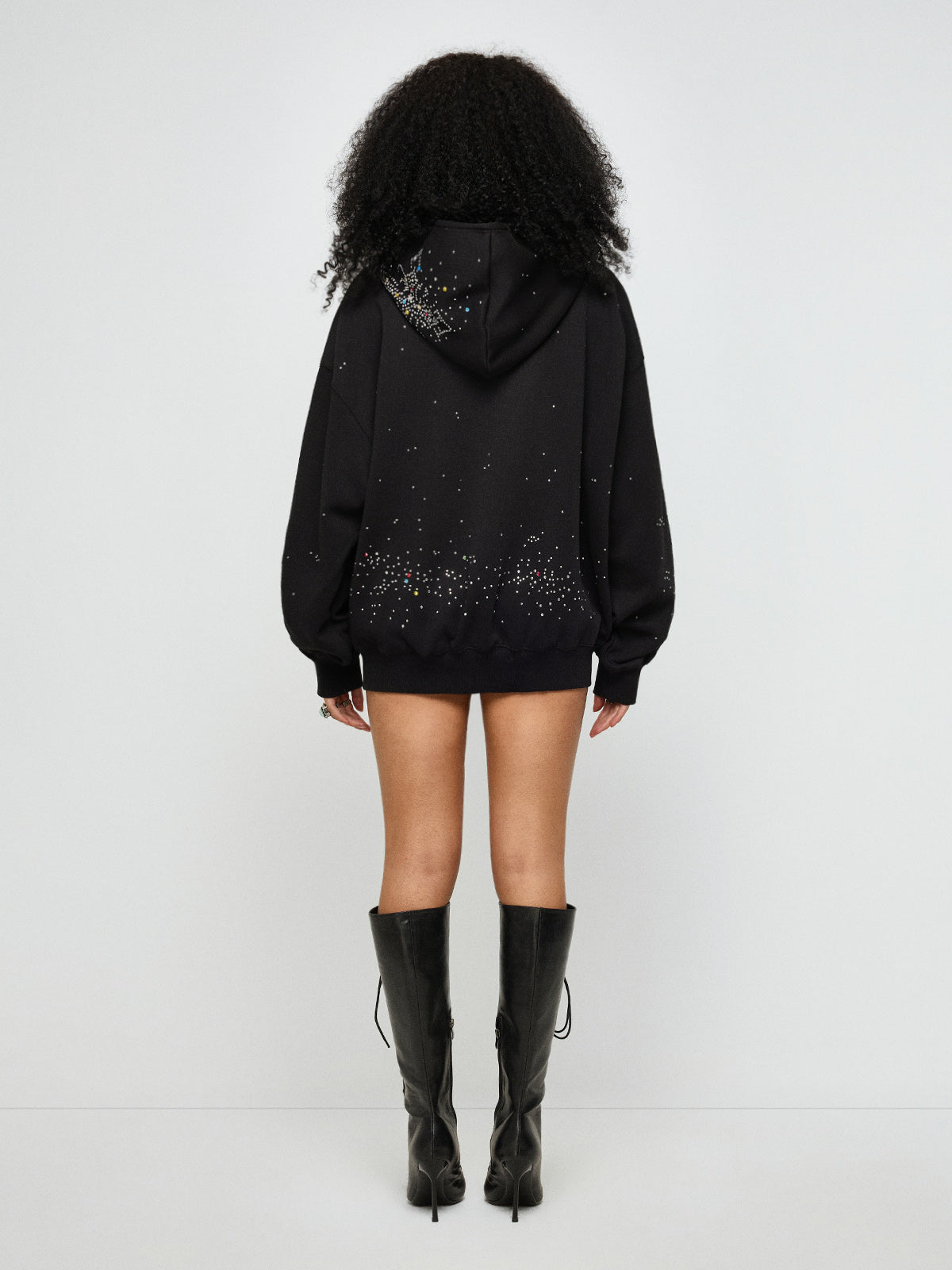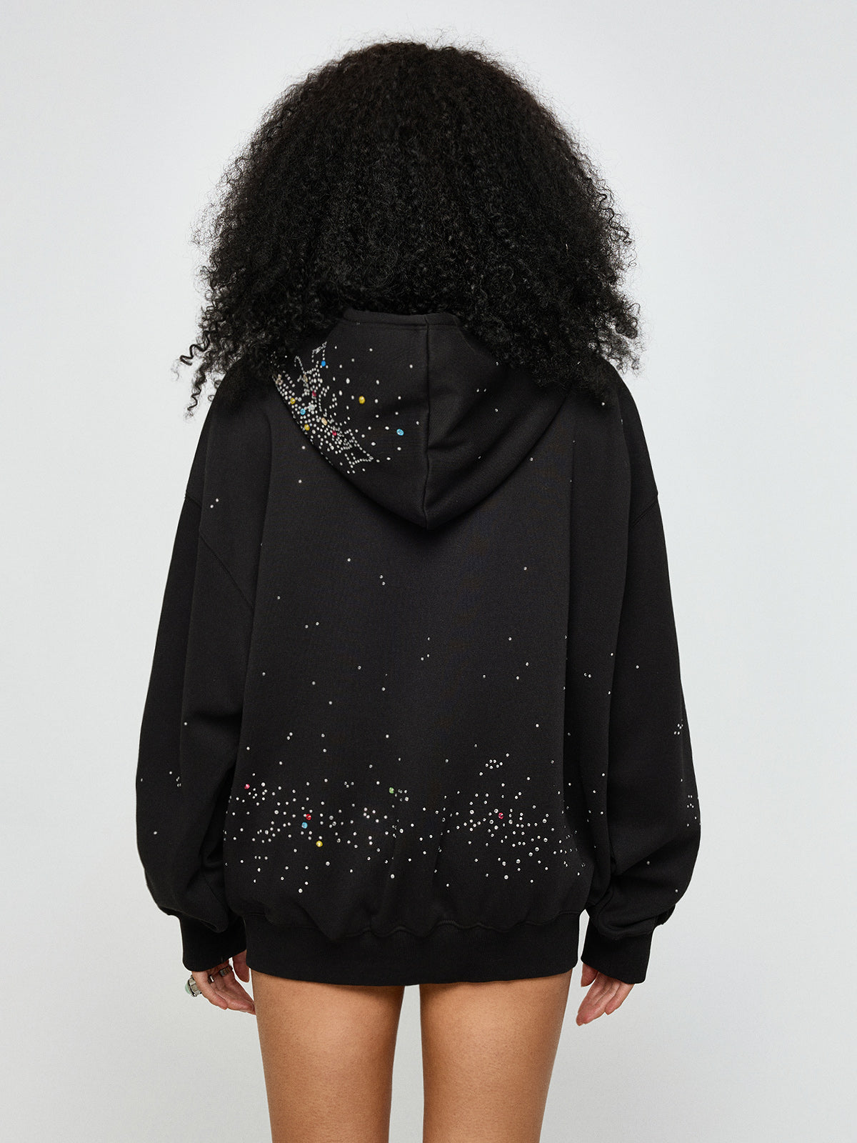Oversized, relaxed, and quietly loaded. This hoodie jacket pairs a loose silhouette with scattered rhinestones that shimmer without asking permission. It’s comfort with intention—easy to layer, easy to steal glances in. Designed for late exits and longer pauses.