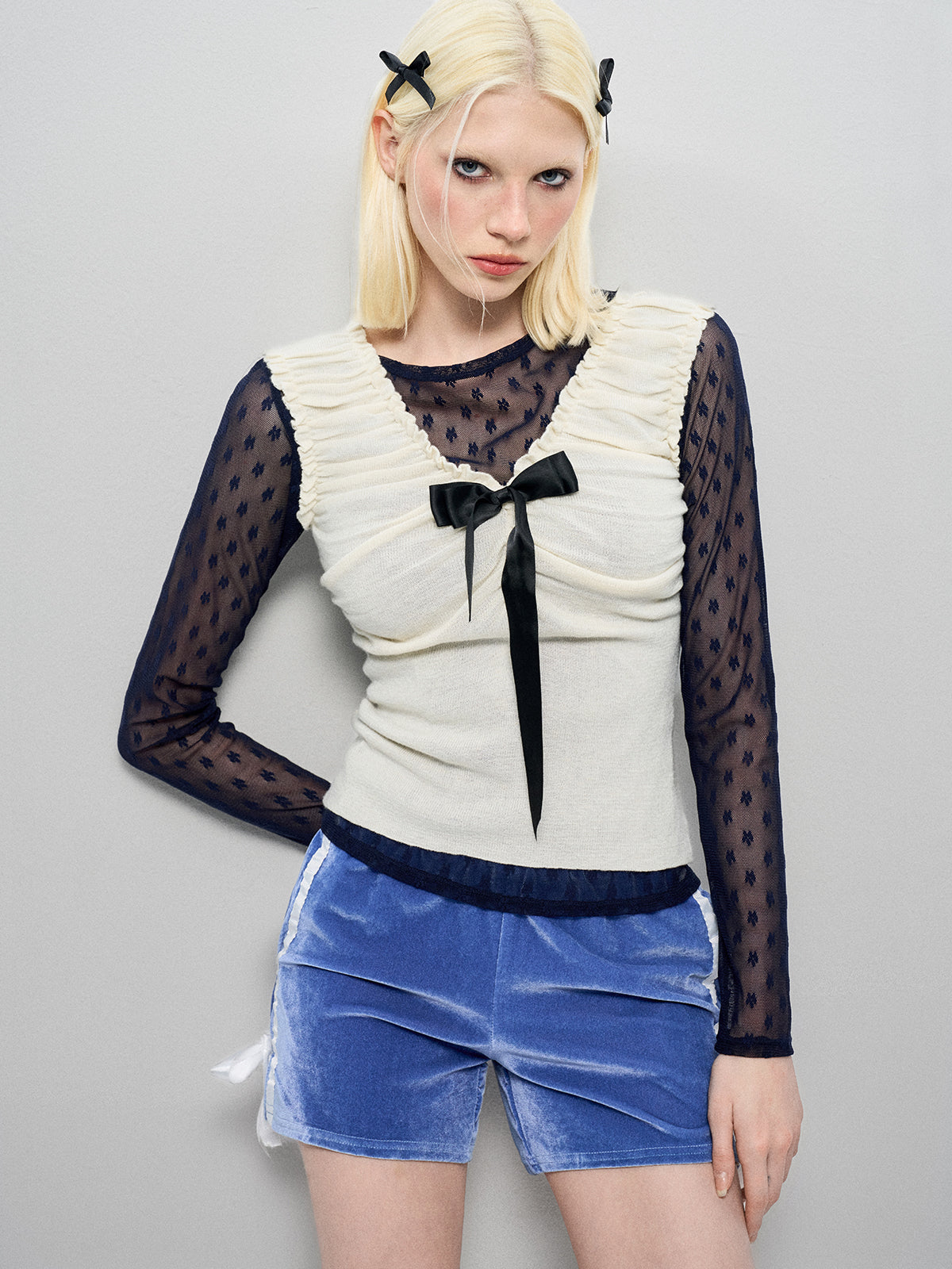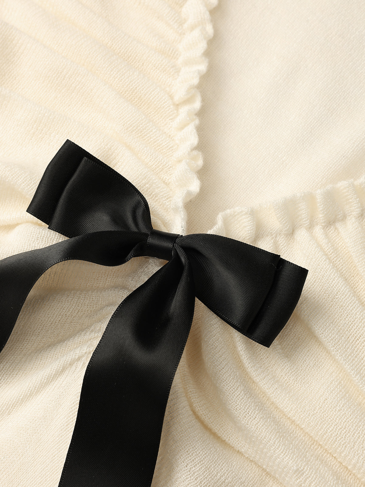 lastic V-neck with delicate ruching, finished with ribbon bow pin. The detachable bow adds instant polish - wear it pinned or tossed in your bag for mood shifts.