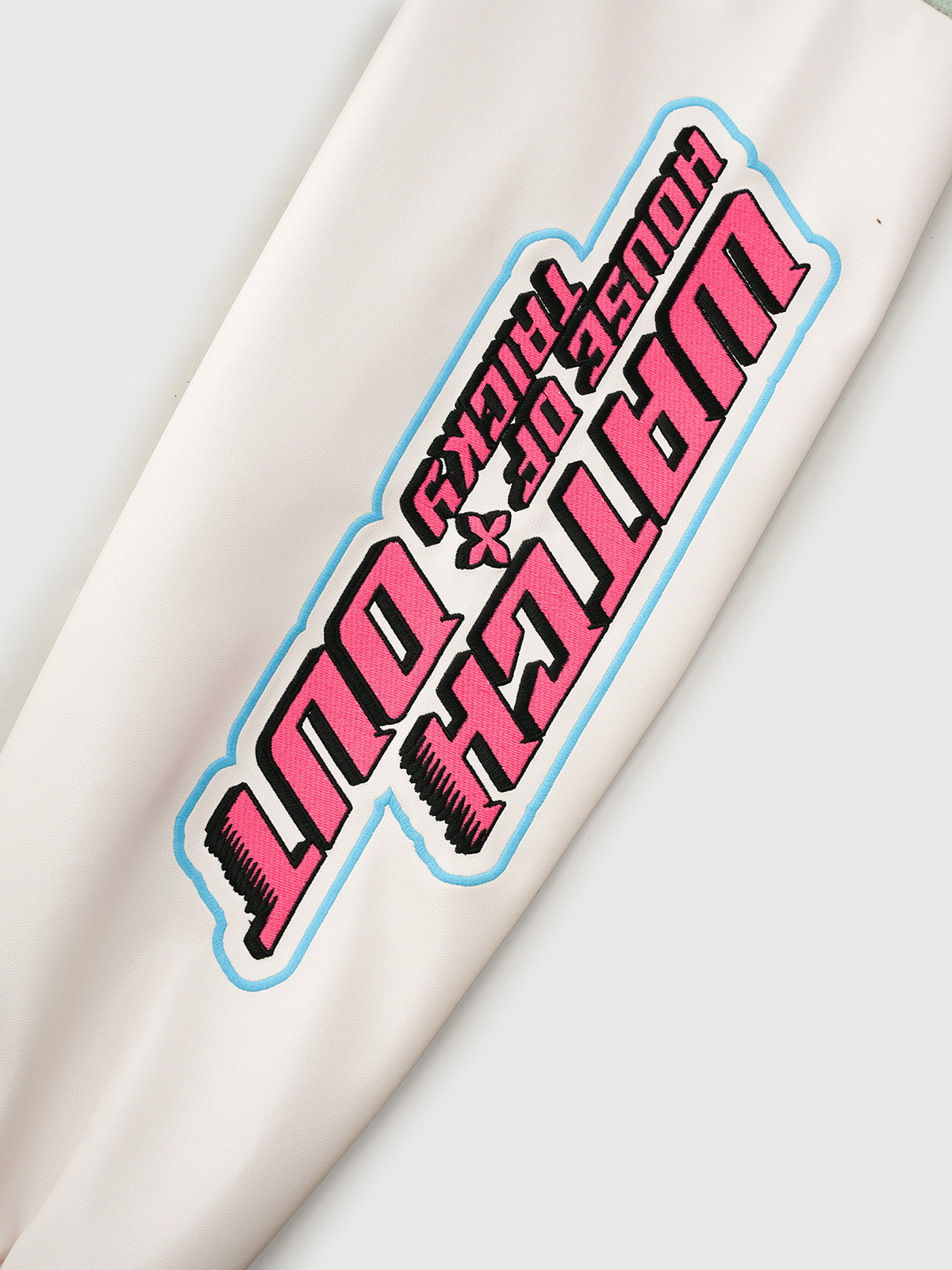Pastel on the surface, electric underneath. This mint-green varsity jacket is covered in bright pink graphics that feel like graffiti notes. Easygoing, bold, and very “not-trying-too-hard”—aka, this piece is like the megaphone of the collection, but still versatile enough for coffee runs.