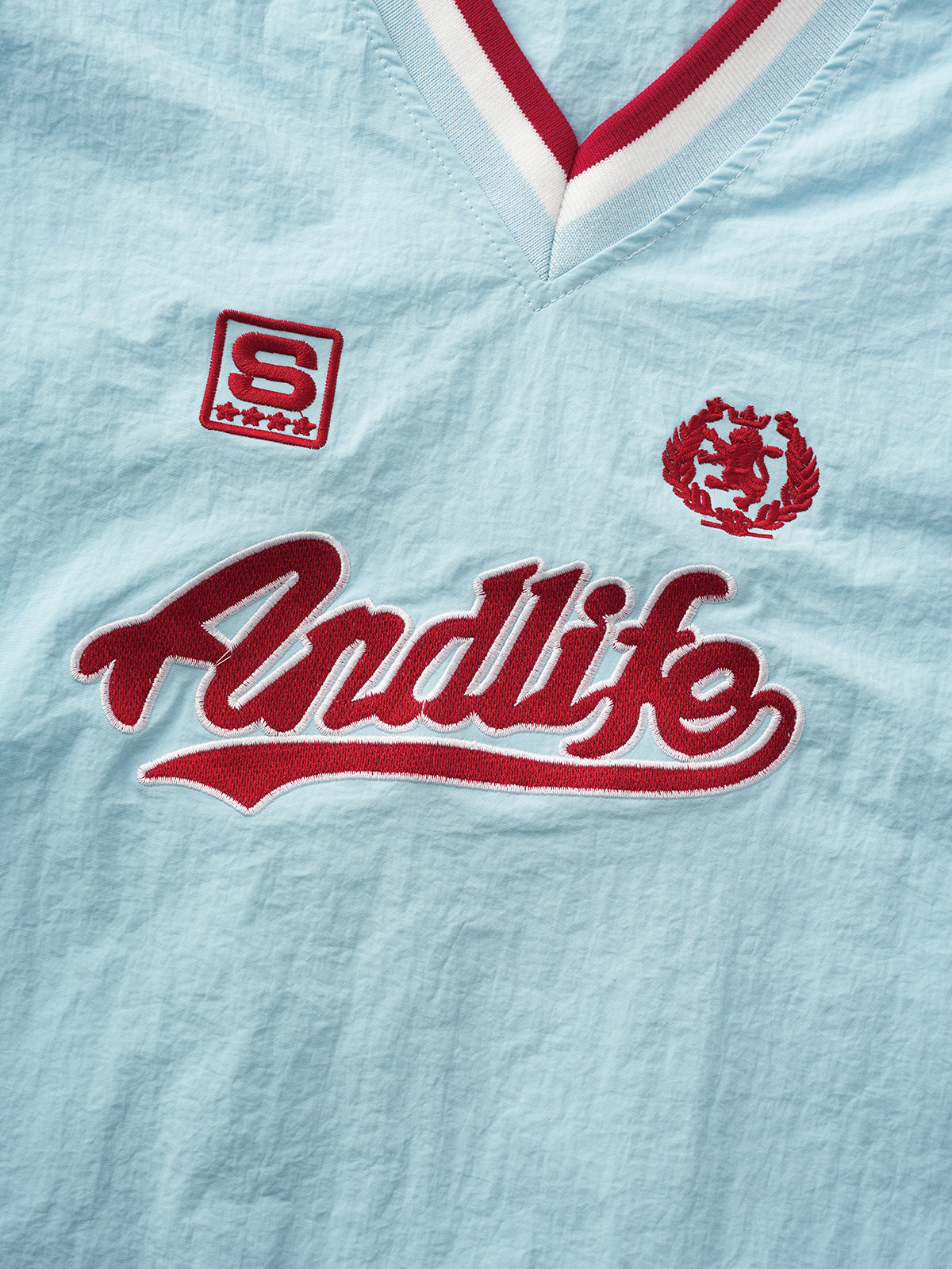 Looks sporty, acts chill. The blue&red V-neck that pairs best with ice cream and fake confidence. Retro stitching, relaxed fit, full personality.