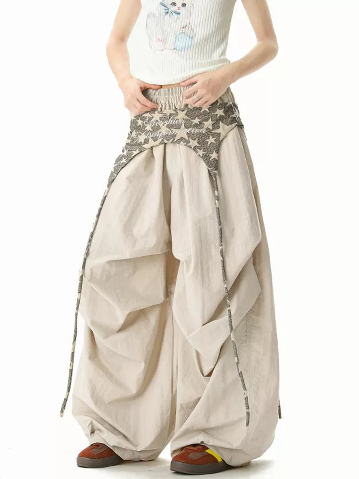 Neutral base, cosmic twist. Loose-fit cargos with a gathered star-print waistband that’s basically a built-in accessory. Cargos that move from morning market runs to late-night noodles without losing their spark.