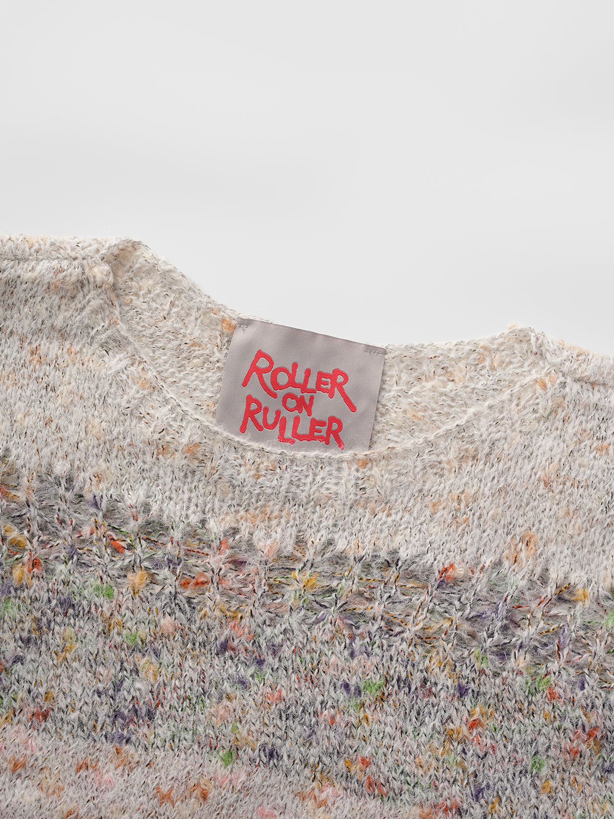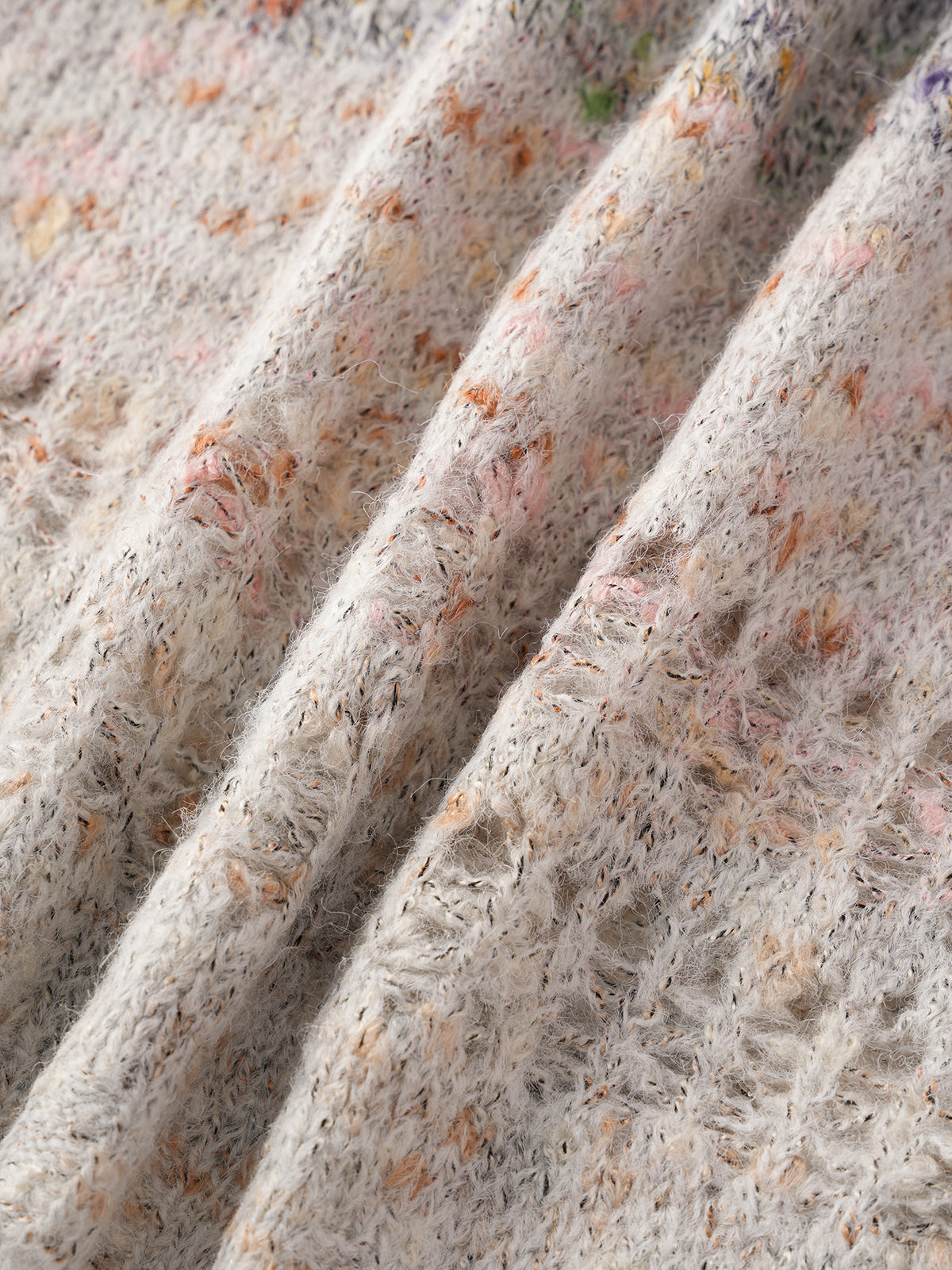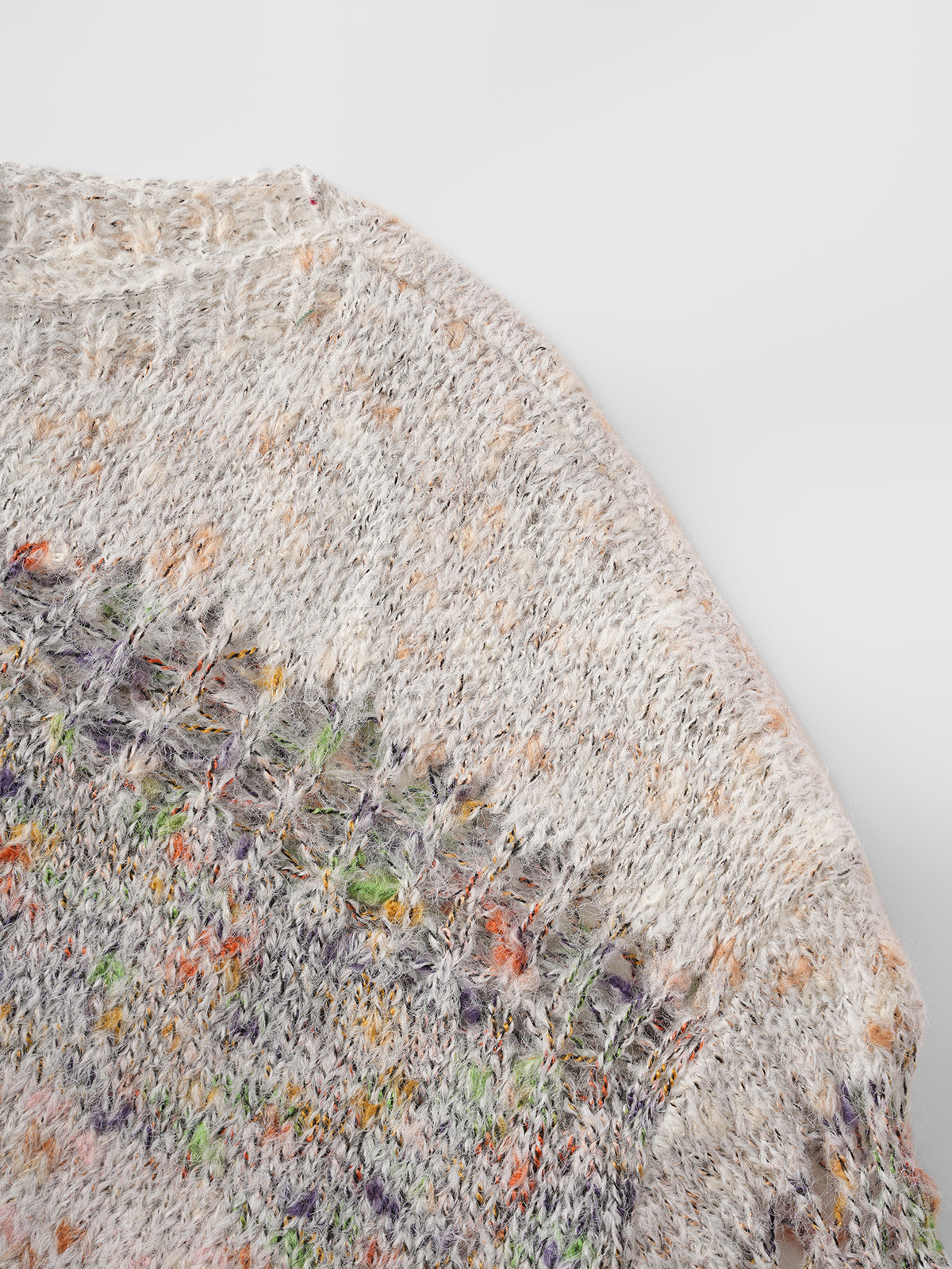 A soft, airy knit scattered with colors like a faded floral memory. Slightly cropped for a light silhouette — perfect for gallery afternoons or coffee chats after work. It’s cozy without trying to be, delicate without being fragile.