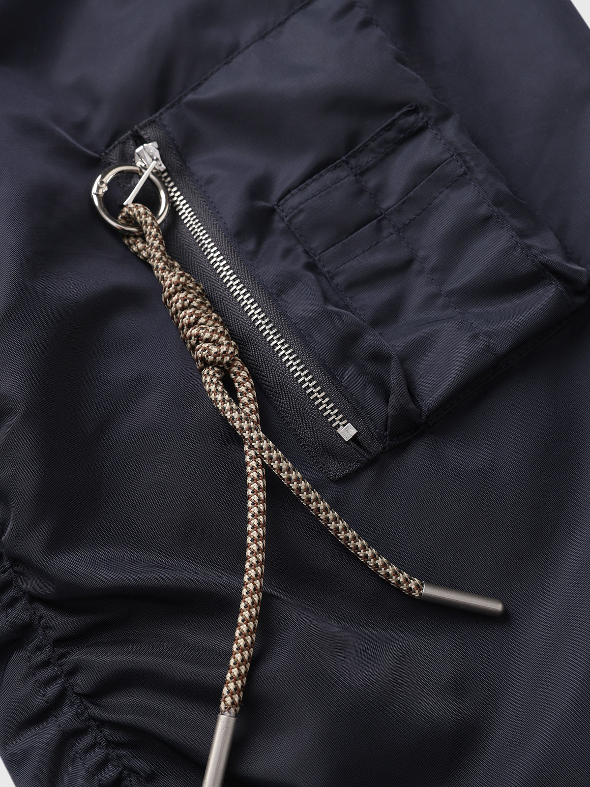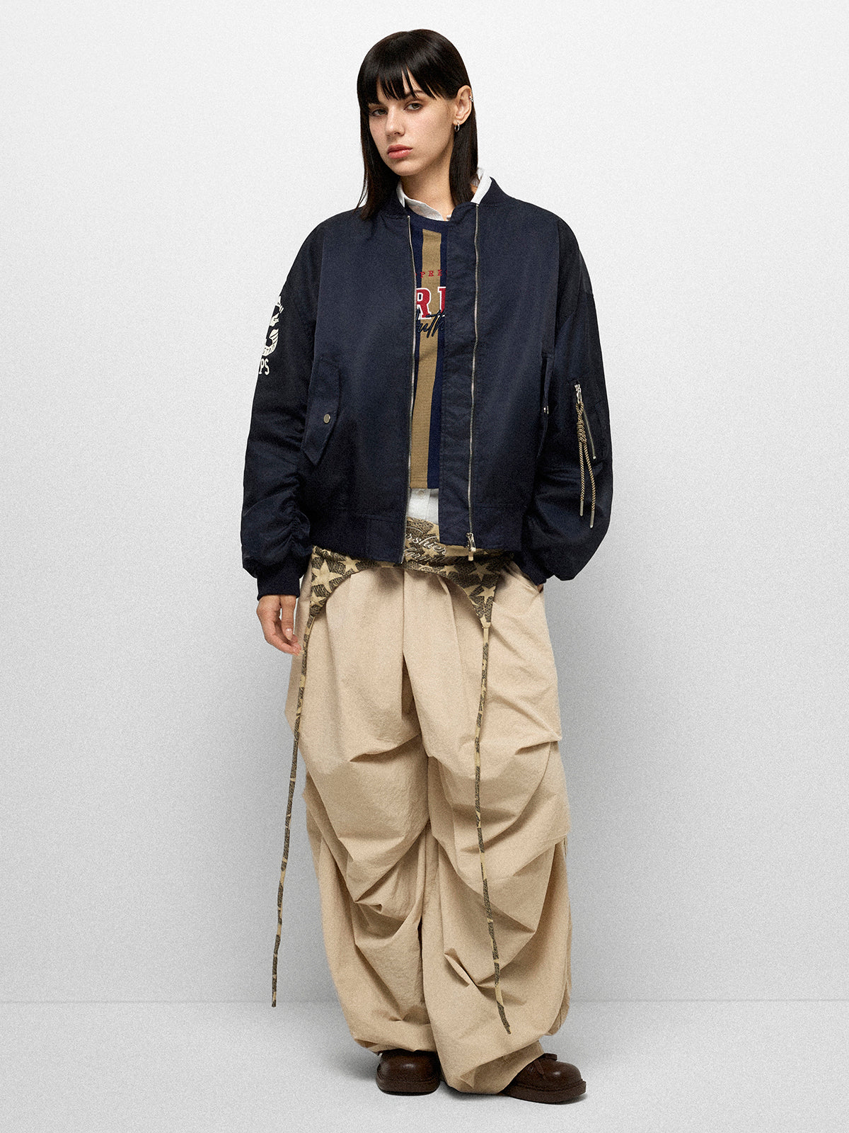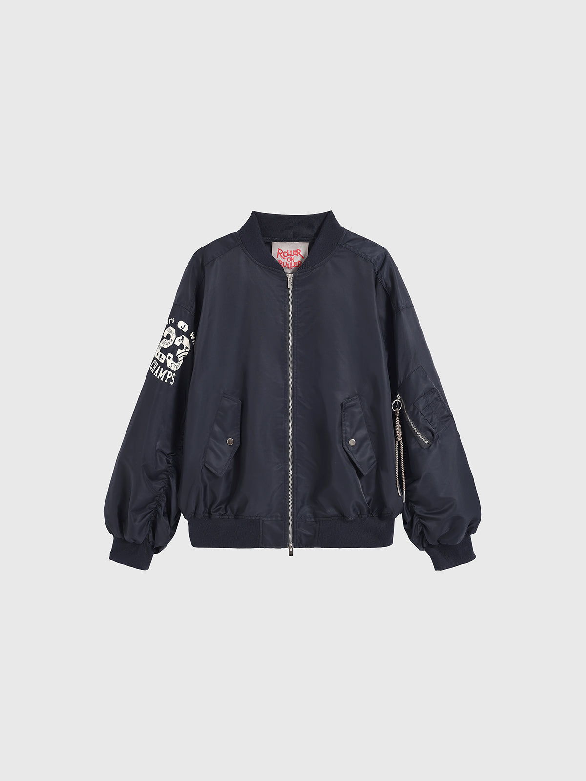 A navy varsity with oversized sleeves, zip-up front, and a graphic back that feels straight out of a vintage campus poster. It’s sporty, bold, and unisex—perfect for layering over tees or skirts when you want that effortless American club vibe.