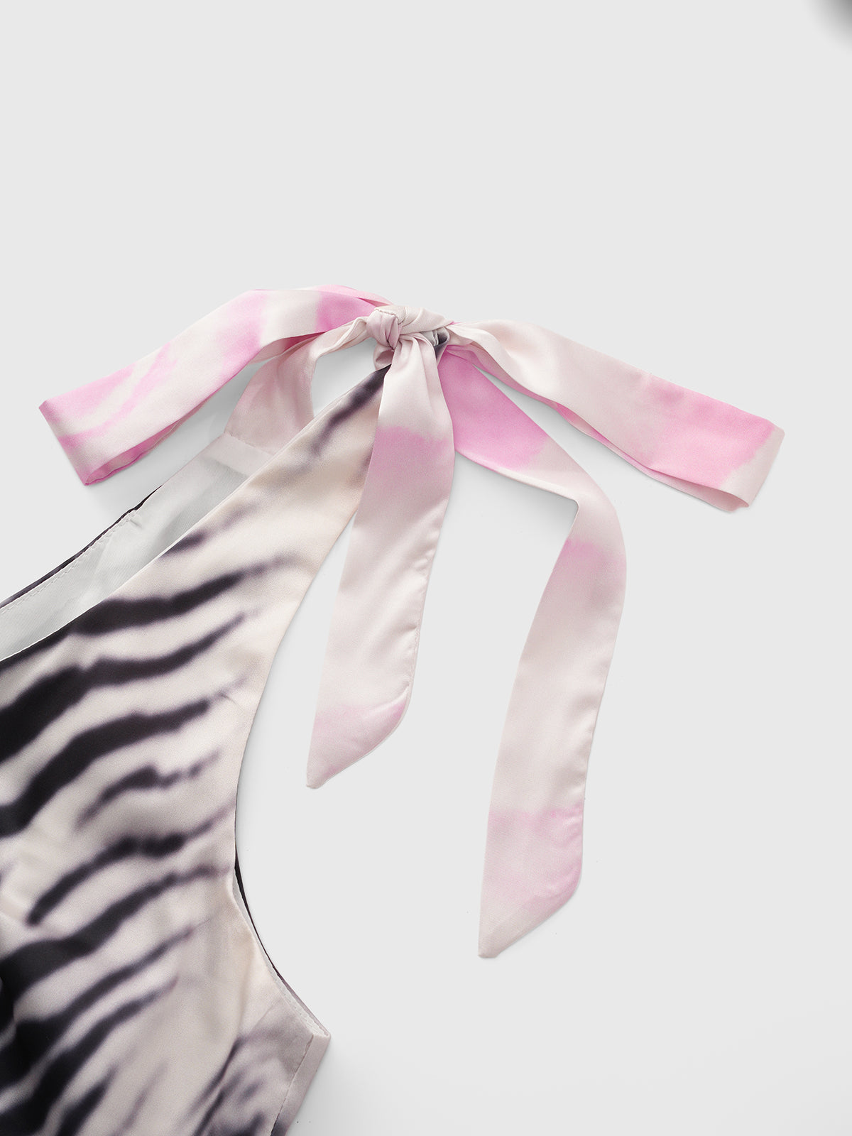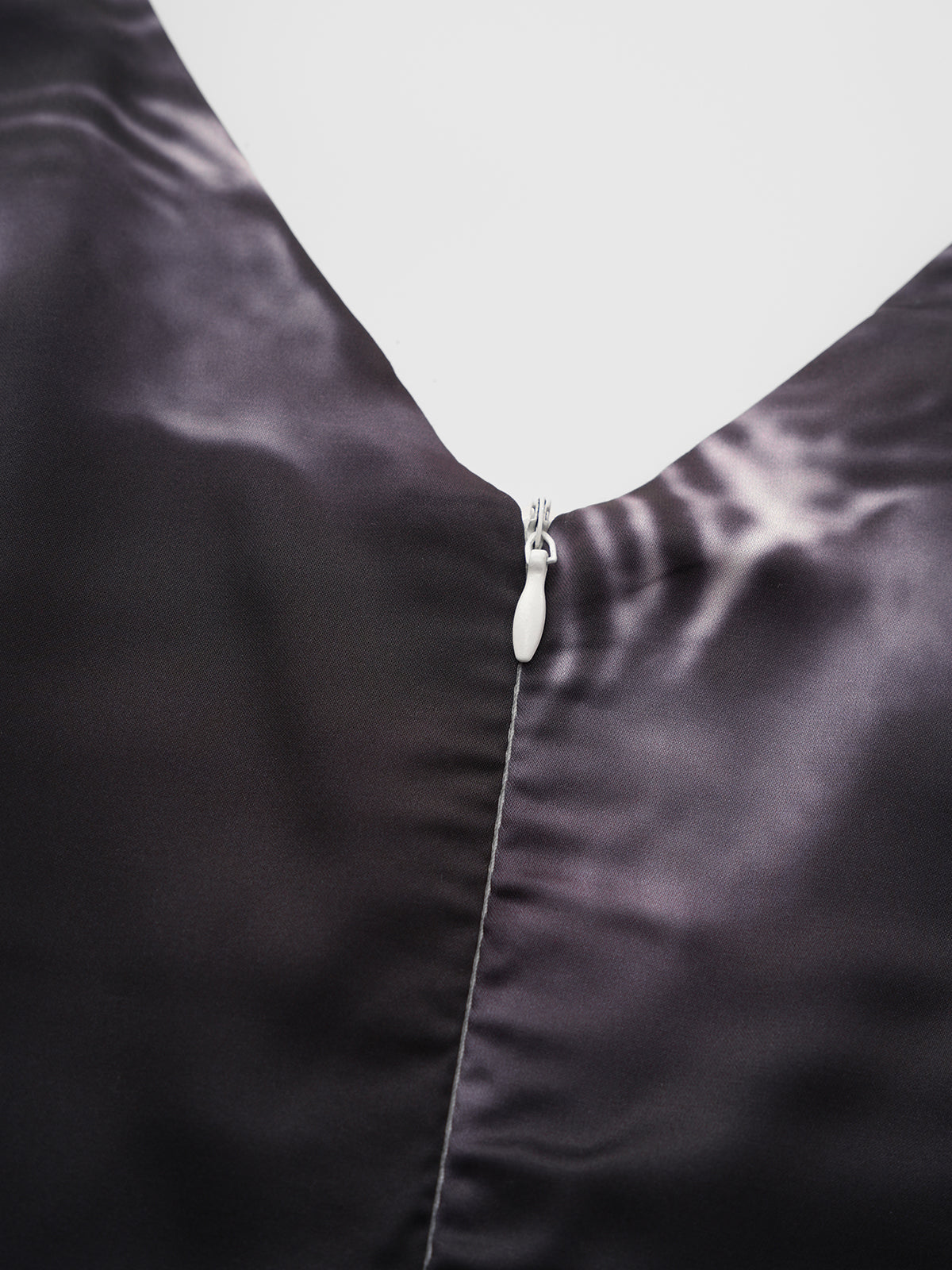 This draped dress blends fluid movement with a quiet sense of tension, letting the fabric fall where it wants, not where it’s told. The print feels romantic at first glance, then slightly off on the second—like flowers after dark. The silhouette skims the body with intention, creating shape through drape rather than force. For when subtle feels stronger than obvious.