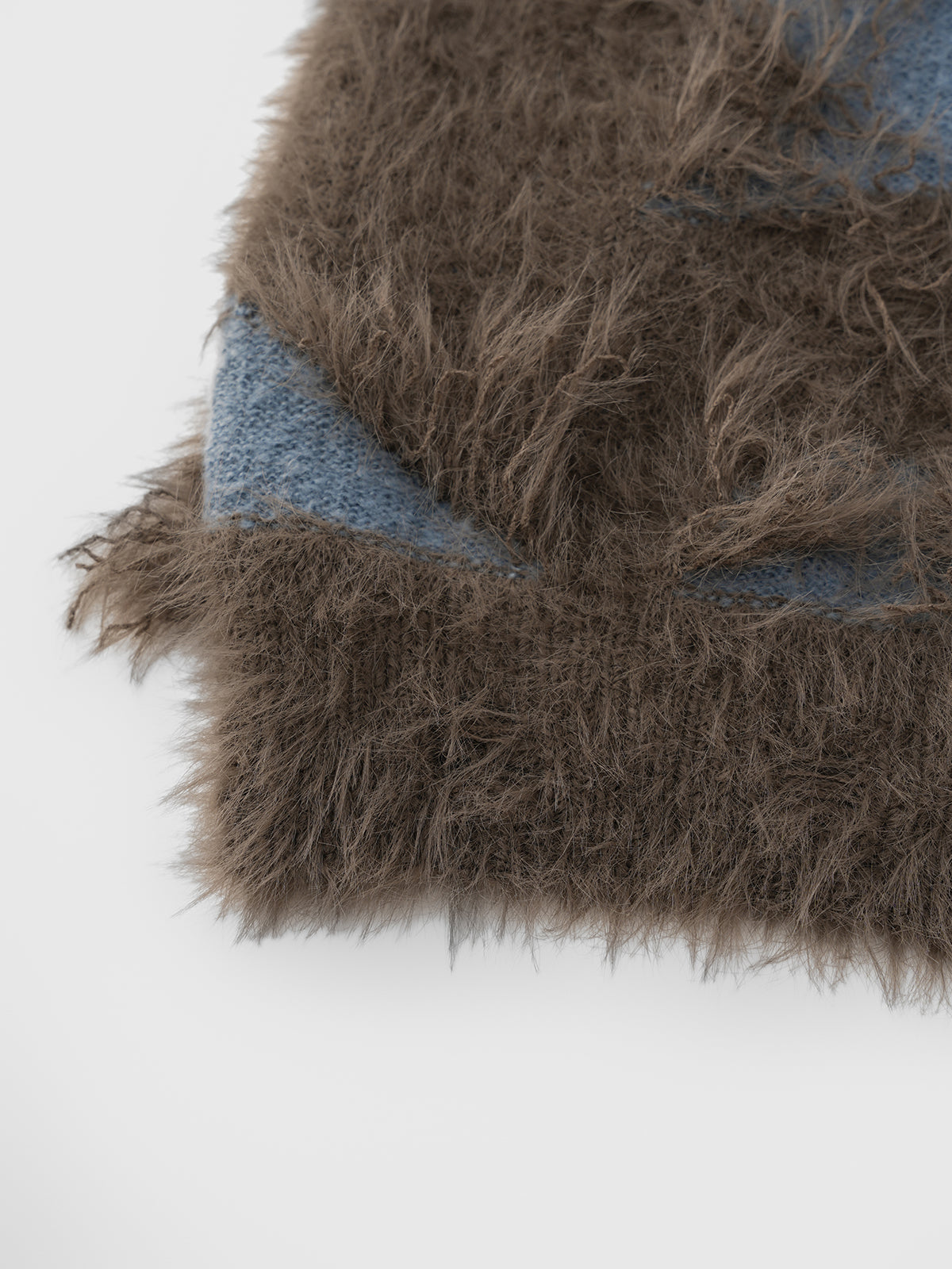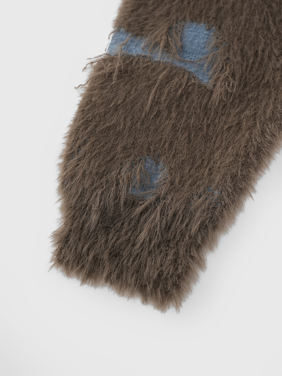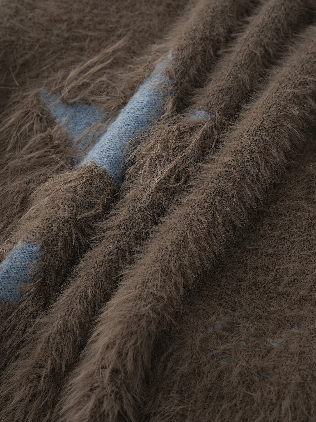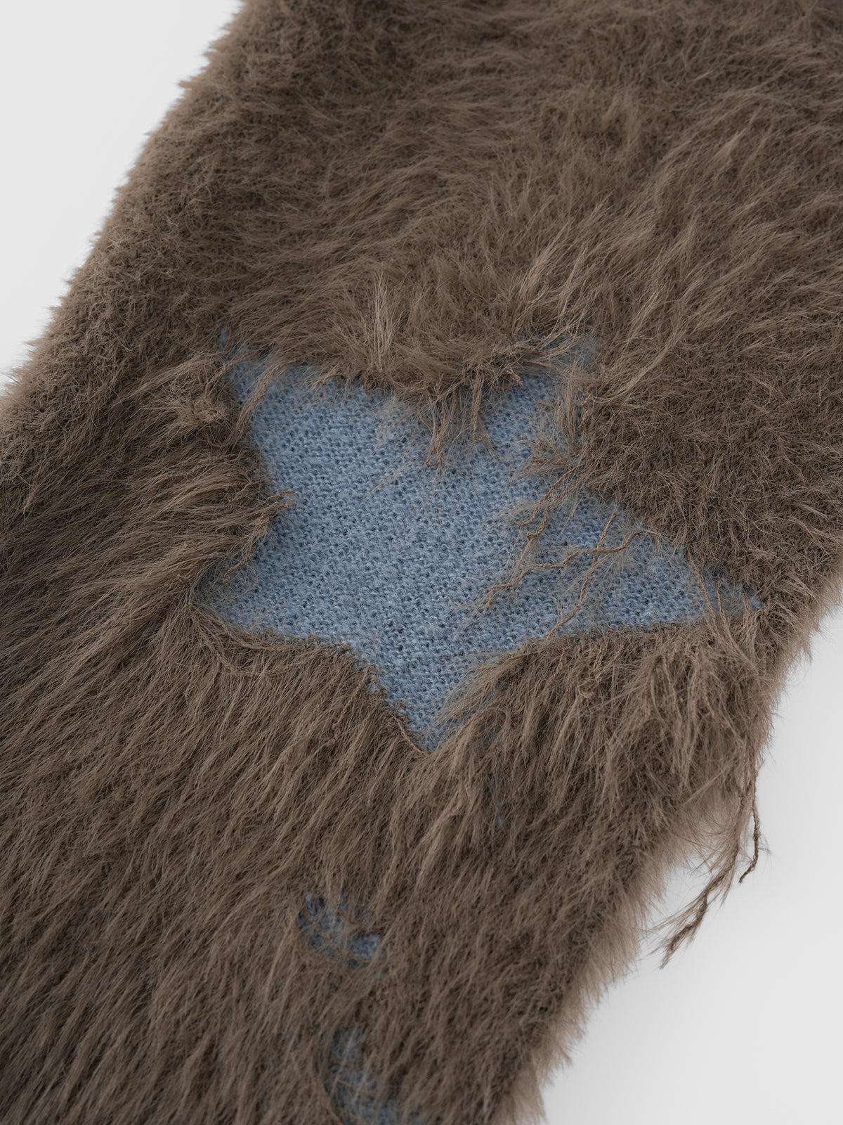 A fuzzy, star-studded sweater that’s as cozy as it is quirky. With soft brown fuzz and pops of sky blue stars, it’s the kind of piece that makes you feel like you’re wearing the night sky. Perfect for those who like their comfort with a side of fun.