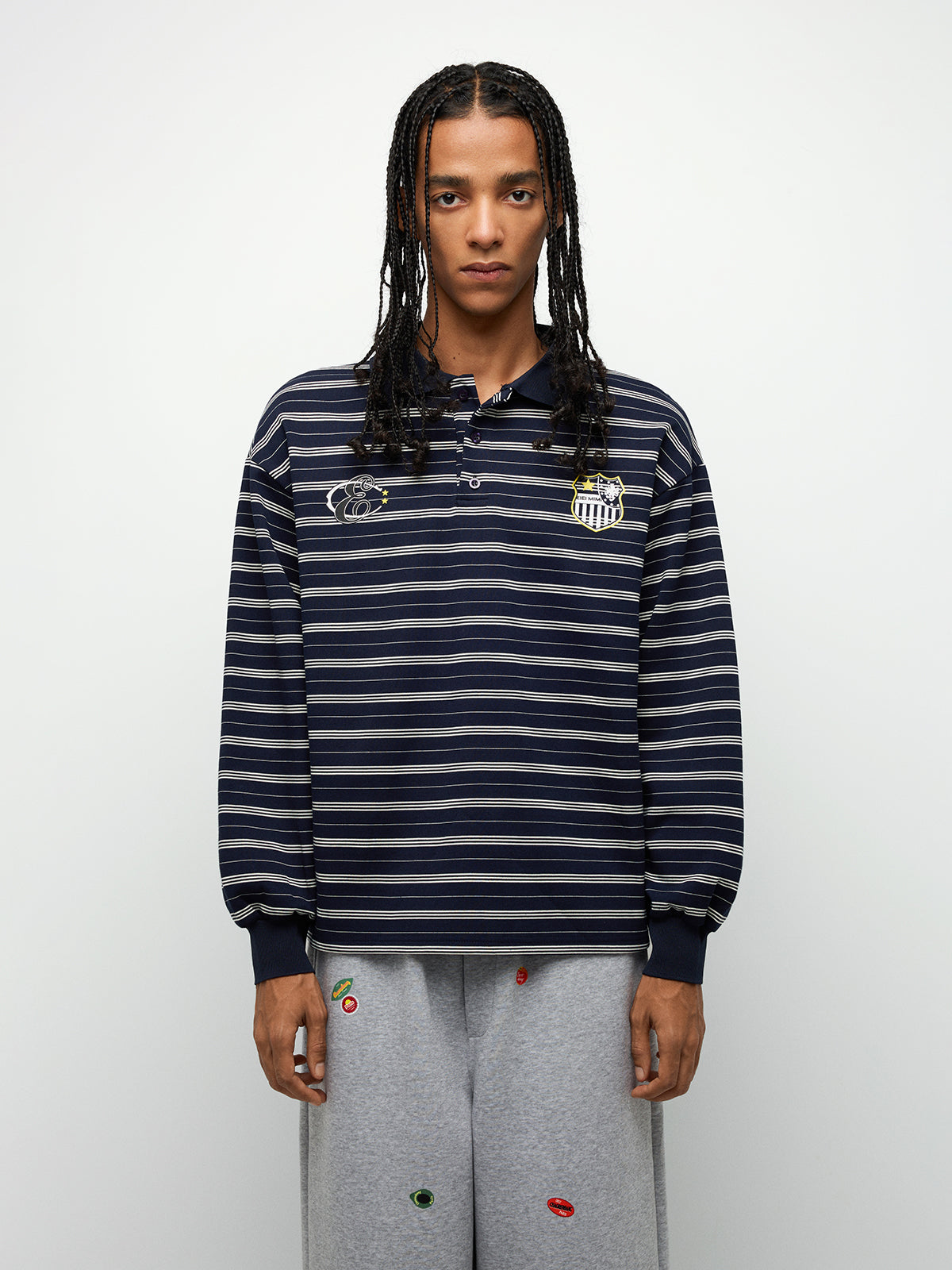 Relaxed-fit grey sweatpants decorated with colorful fruit sticker patches across the legs. Crafted with soft fabric, elastic waistband, and adjustable hem for all-day comfort and style.
