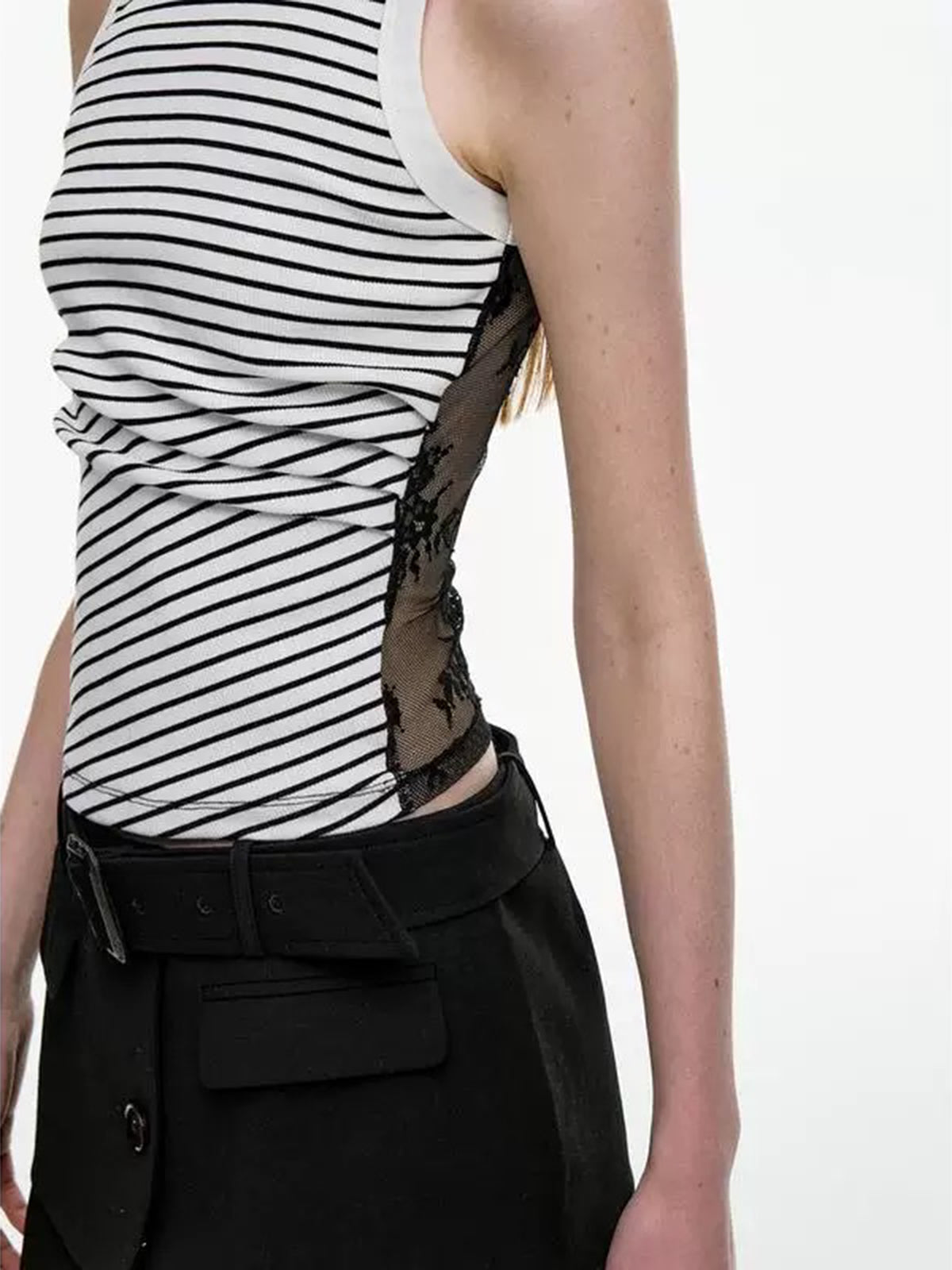 Soft, sculpted, and a little see-through where it counts. The kind of tank that looks accidental yet planned — a mix of sporty rhythm and lace-like grace. Made for boutique browsing, rooftop sketches, or late dinners where conversation lingers longer than the playlist.