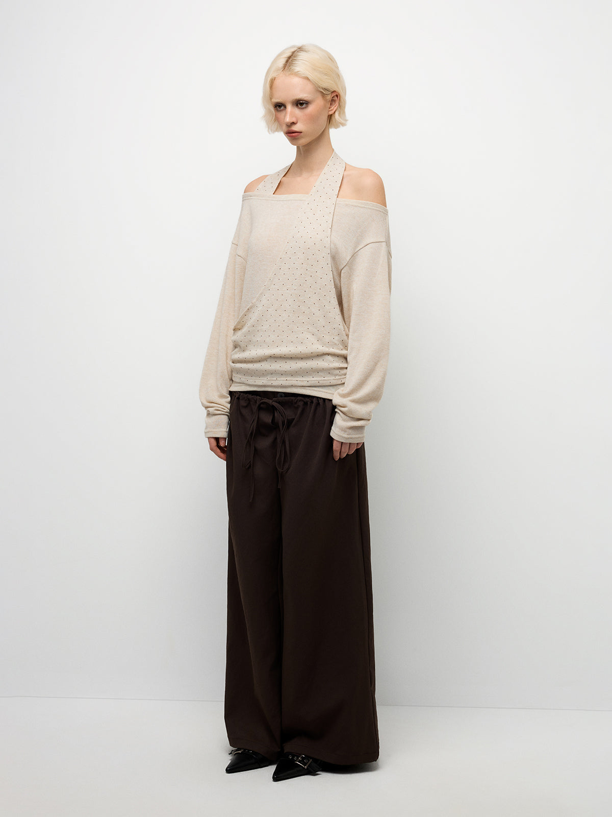 Wide legs, tie waist, and a silhouette built for rhythm. These trousers move with composure while hinting at hidden softness. For the woman who walks with balance, carrying warmth and polish in equal measure.