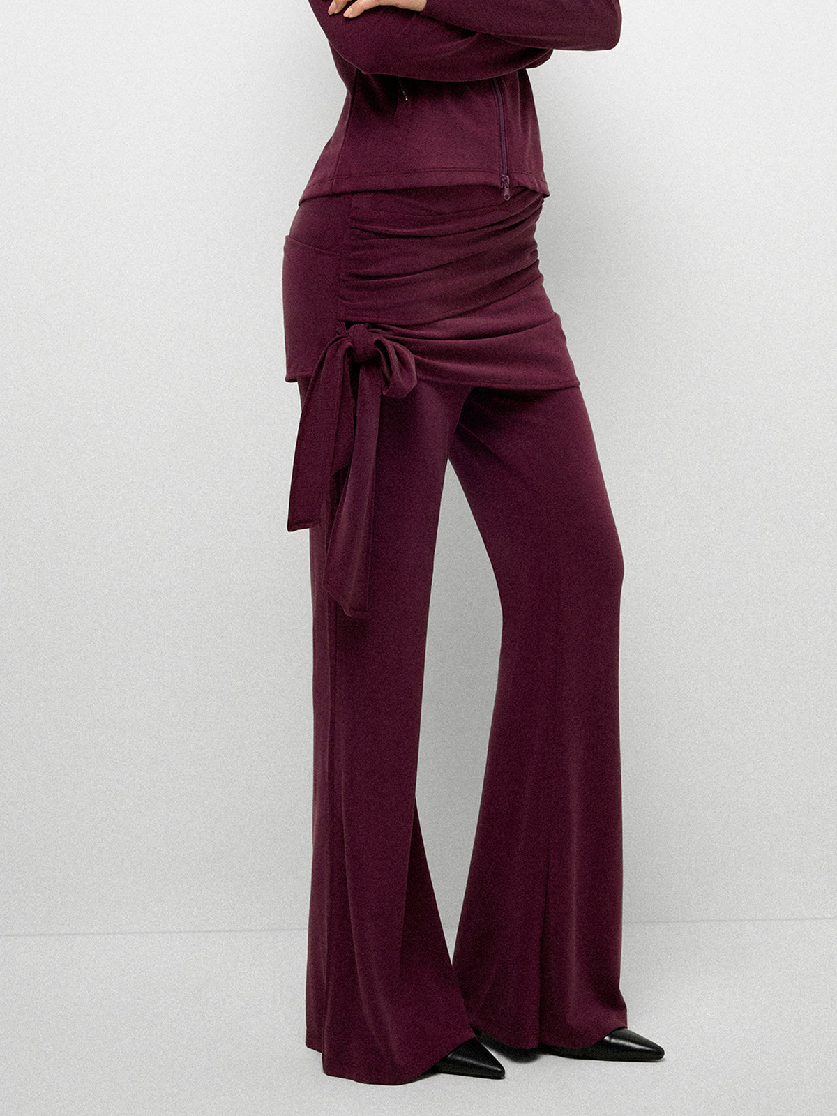 High-waist burgundy flared yoga pants with a tied waist detail. Sleek stretch meets playful accents, making them just as perfect for studio sessions as for styled-up city strolls.